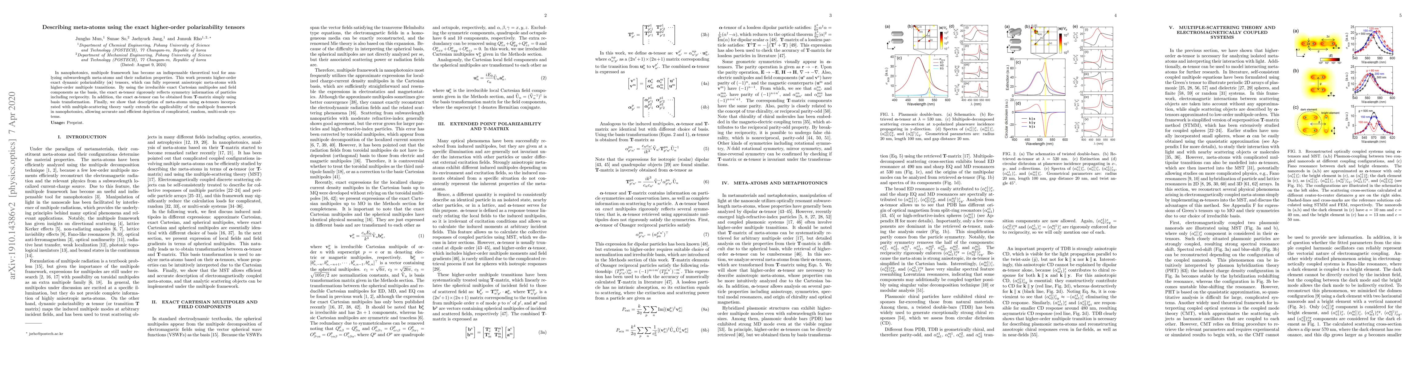 In nanophotonics, multipole framework has become an indispensable theoretical tool for analyzing subwavelength meta-atoms and their radiation properties. This work presents higher-order exact dynamic polarizability (alpha) tensors, which can fully represent anisotropic meta-atoms with higher-order multipole transitions. By using the irreducible exact Cartesian multipoles and field components as the basis, the exact alpha-tensor rigorously reflects symmetry information of particles including reciprocity. In addition, the exact alpha-tensor can be obtained from T-matrix simply using basis transformation. Finally, we show that description of meta-atoms using alpha-tensors incorporated with multiple-scattering theory vastly extends the applicability of the multipole framework in nanophotonics, allowing accurate and efficient depiction of complicated, random, multi-scale systems.