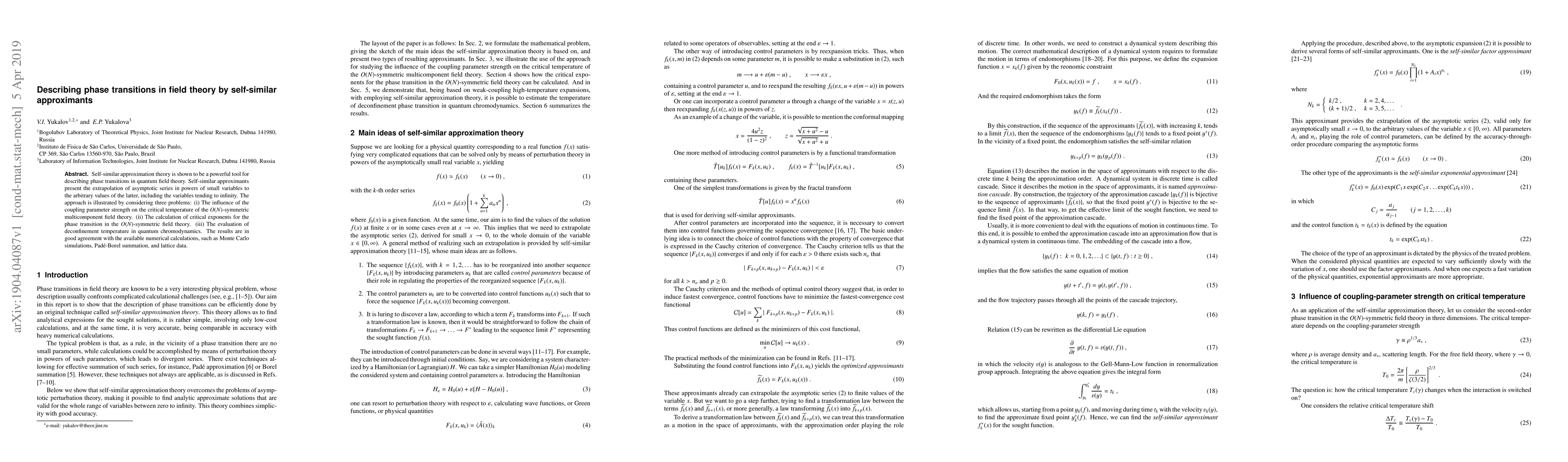 Self-similar approximation theory is shown to be a powerful tool for describing phase transitions in quantum field theory. Self-similar approximants present the extrapolation of asymptotic series in powers of small variables to the arbitrary values of the latter, including the variables tending to infinity. The approach is illustrated by considering three problems: (i) The influence of the coupling parameter strength on the critical temperature of the O(N)-symmetric multicomponent field theory. (ii) The calculation of critical exponents for the phase transition in the O(N)-symmetric field theory. (iii) The evaluation of deconfinement temperature in quantum chromodynamics. The results are in good agreement with the available numerical calculations, such as Monte Carlo simulations, Pade-Borel summation, and lattice data.