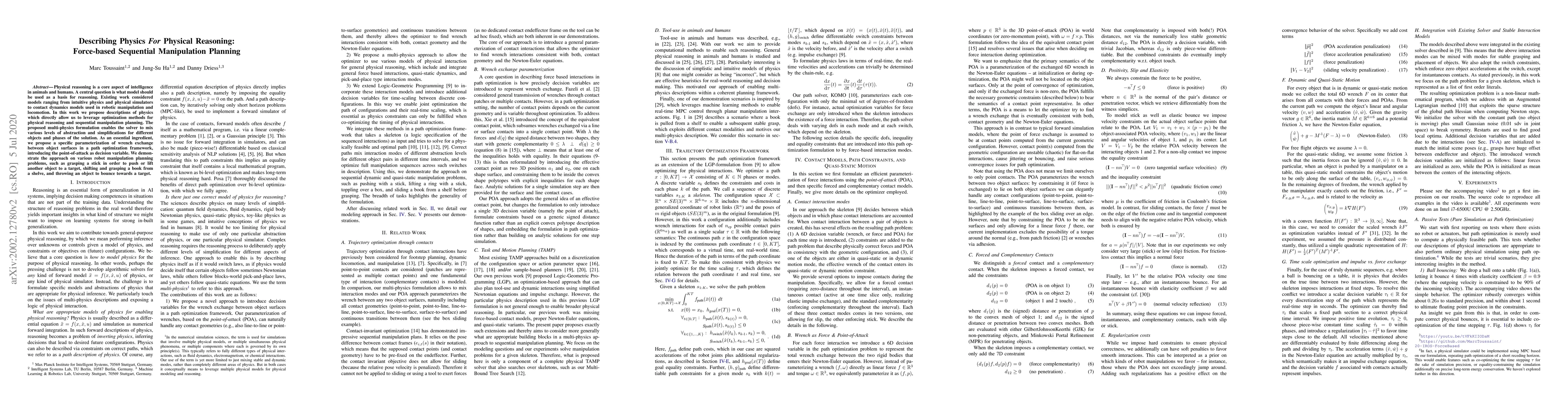 Physical reasoning is a core aspect of intelligence in animals and humans. A central question is what model should be used as a basis for reasoning. Existing work considered models ranging from intuitive physics and physical simulators to contact dynamics models used in robotic manipulation and locomotion. In this work we propose descriptions of physics which directly allow us to leverage optimization methods for physical reasoning and sequential manipulation planning. The proposed multi-physics formulation enables the solver to mix various levels of abstraction and simplifications for different objects and phases of the solution. As an essential ingredient, we propose a specific parameterization of wrench exchange between object surfaces in a path optimization framework, introducing the point-of-attack as decision variable. We demonstrate the approach on various robot manipulation planning problems, such as grasping a stick in order to push or lift another object to a target, shifting and grasping a book from a shelve, and throwing an object to bounce towards a target.