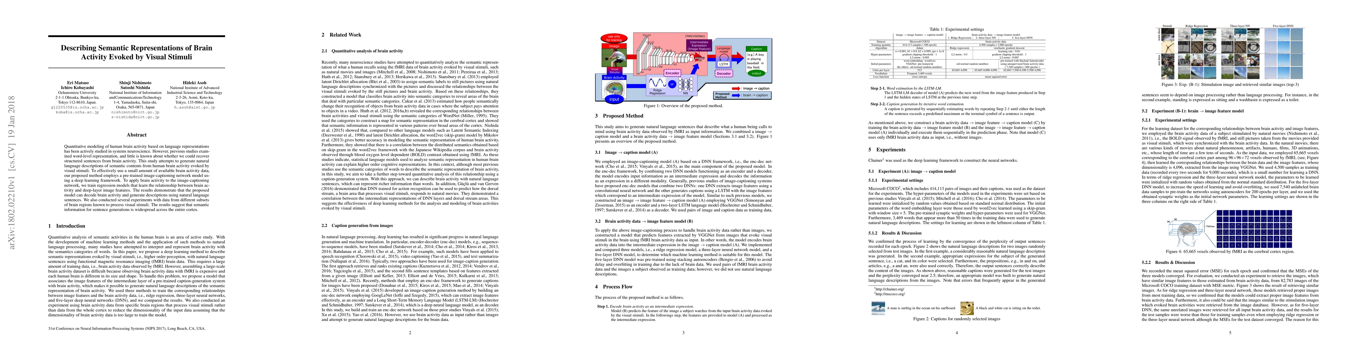 This study proposes a method to decode brain activity evoked by visual stimuli into natural language descriptions using a pre-trained image-captioning network and regression models. The results show that semantic information for generating sentences is distributed across the entire cortex, not limited to specific regions.