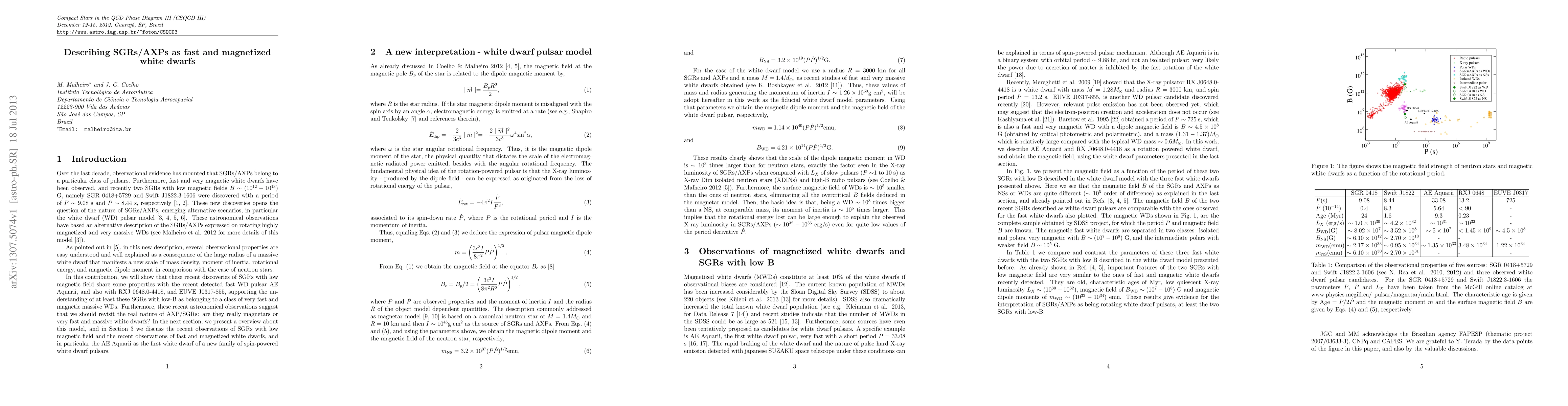 Over the last decade, observational evidence has mounted that SGRs/AXPs belong to a particular class of pulsars. Furthermore, fast and very magnetic white dwarfs have been observed, and recently two SGRs with low magnetic fields $B\sim(10^{12}-10^{13})$ G, namely SGR 0418+5729 and Swift J1822.3-1606 were discovered with a period of $P\sim9.08$ s and $P\sim8.44$ s, respectively. These new discoveries opens the question of the nature of SGRs/AXPs, emerging alternative scenarios, in particular the white dwarf (WD) pulsar model. These astronomical observations have based an alternative description of the SGRs/AXPs expressed on rotating highly magnetized and very massive WDs. In this new description, several observational properties are easy understood and well explained as a consequence of the large radius of a massive white dwarf that manifests a new scale of mass density, moment of inertia, rotational energy, and magnetic dipole moment in comparison with the case of neutron stars. In this contribution, we will show that these recent discoveries of SGRs with low magnetic field share some properties with the recent detected fast WD pulsar AE Aquarii, and also with RXJ 0648.0-4418, and EUVE J0317-855, supporting the understanding of at least these SGRs with low-B as belonging to a class of very fast and magnetic massive WDs. Furthermore, these recent astronomical observations suggest that we should revisit the real nature of AXP/SGRs: are they really magnetars or very fast and massive white dwarfs?