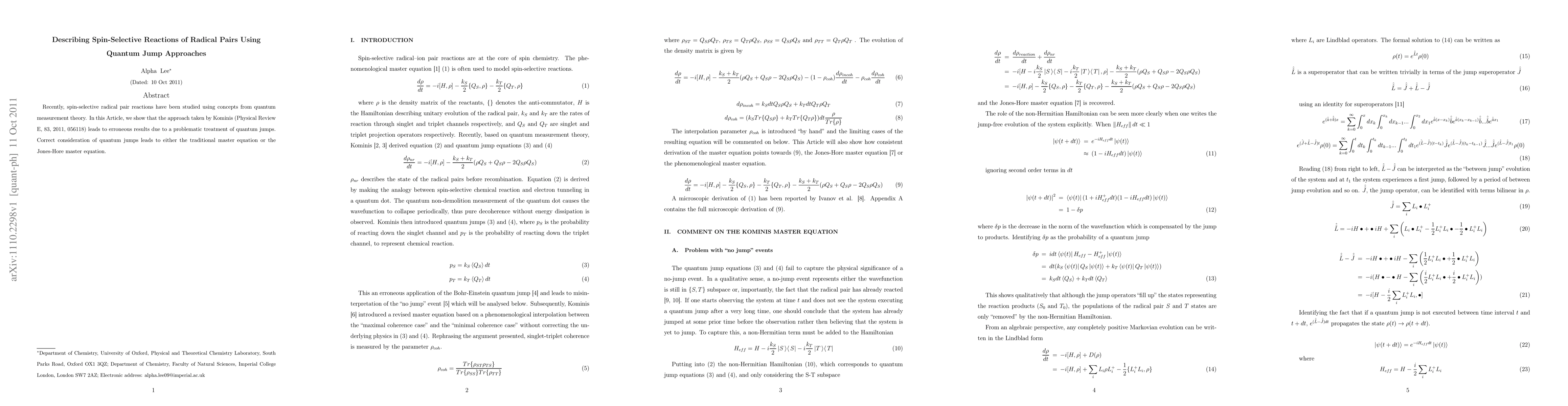 This paper corrects erroneous results in spin-selective radical pair reactions by addressing the flawed treatment of quantum jumps in previous studies, leading to accurate descriptions via the traditional or Jones-Hore master equation.