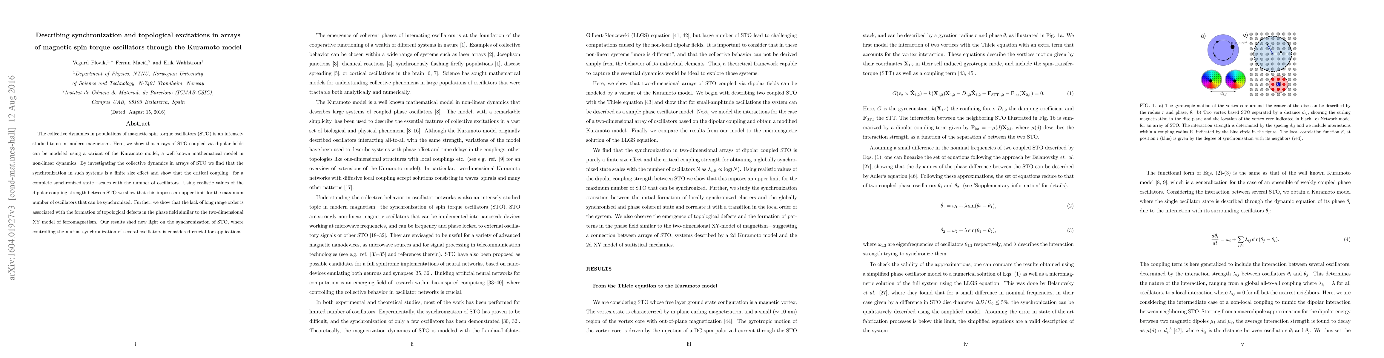 This paper models the synchronization dynamics in arrays of magnetic spin torque oscillators using a variant of the Kuramoto model, revealing that synchronization is a finite size effect and that the critical coupling scales with the number of oscillators. It also identifies topological defects in the phase field, akin to those in the XY model, highlighting their role in the lack of long-range order.