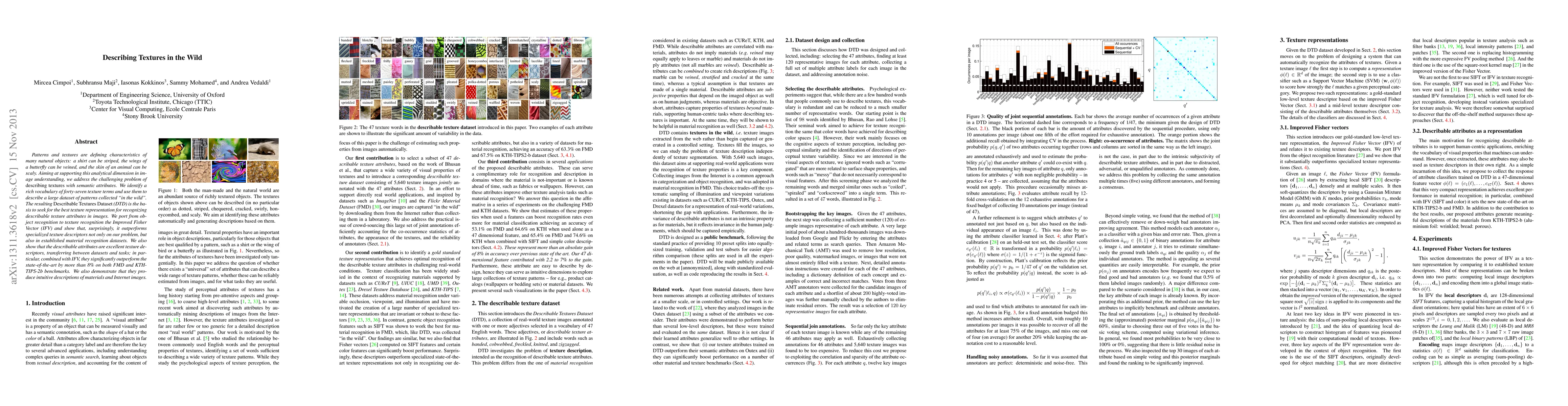 This paper describes a dataset for describable textures and evaluates texture recognition methods using semantic attributes. The Improved Fisher Vector outperforms specialized texture descriptors, and describable attributes combined with IFV achieve state-of-the-art results on benchmark datasets.