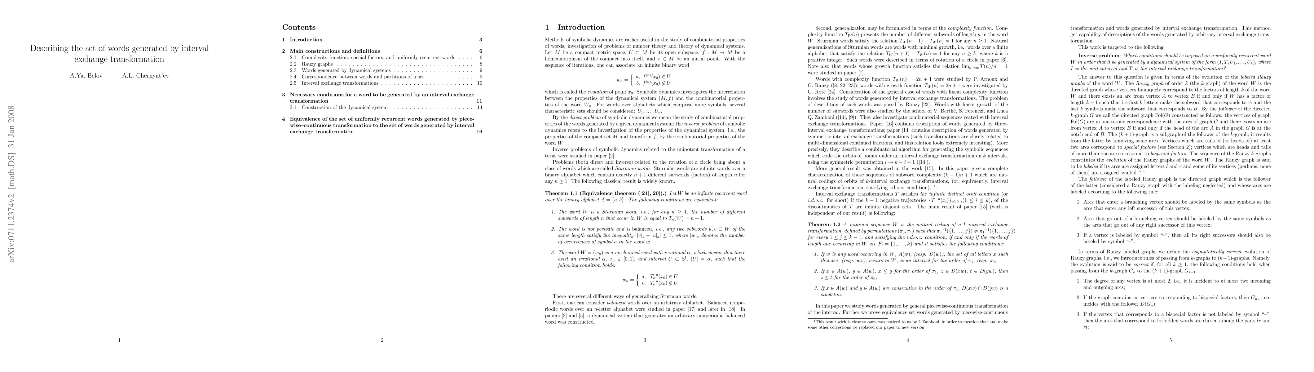 Let $W$ be an infinite word over finite alphabet $A$. We get combinatorial criteria of existence of interval exchange transformations that generate the word W.