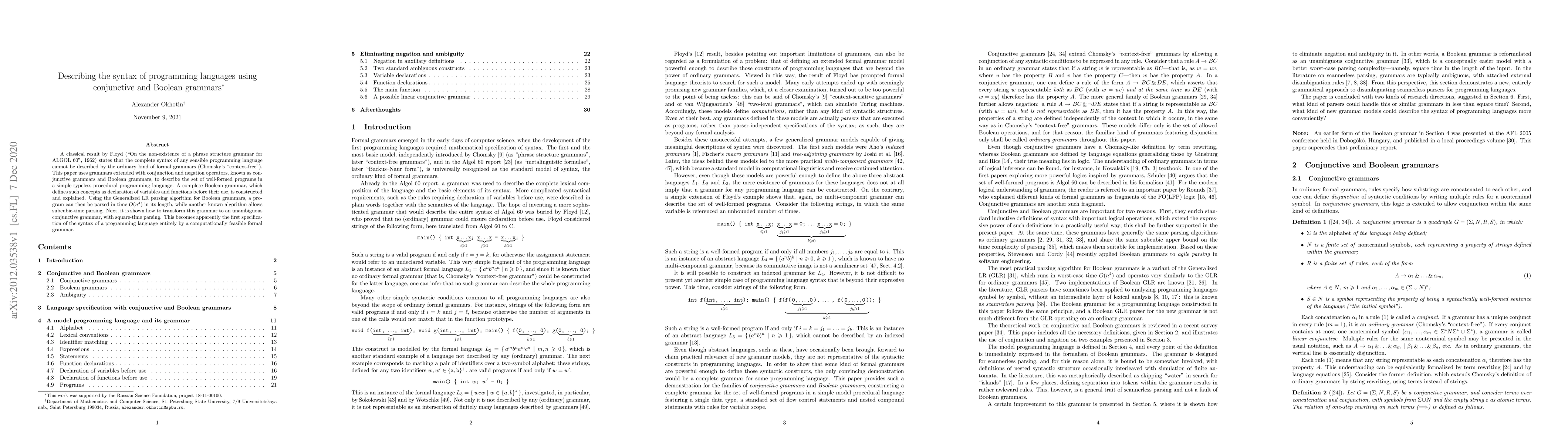 This paper proposes the use of conjunctive and Boolean grammars to describe the complete syntax of a simple typeless procedural programming language, overcoming the limitations of traditional context-free grammars. It constructs a complete Boolean grammar and demonstrates efficient parsing algorithms, marking the first feasible formal grammar specification for programming language syntax.