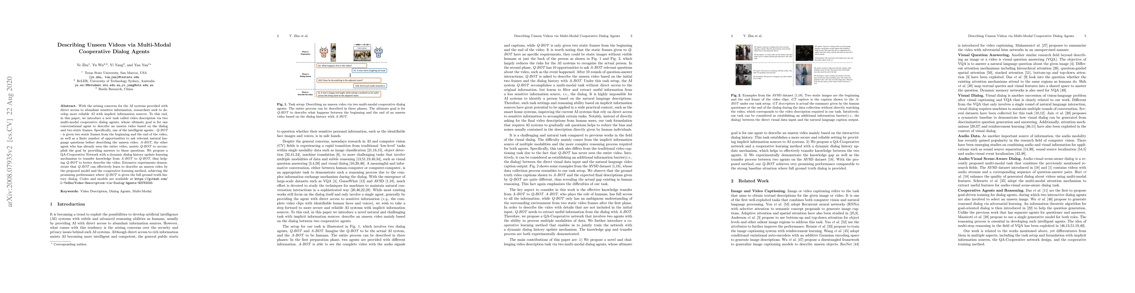 With the arising concerns for the AI systems provided with direct access to abundant sensitive information, researchers seek to develop more reliable AI with implicit information sources. To this end, in this paper, we introduce a new task called video description via two multi-modal cooperative dialog agents, whose ultimate goal is for one conversational agent to describe an unseen video based on the dialog and two static frames. Specifically, one of the intelligent agents - Q-BOT - is given two static frames from the beginning and the end of the video, as well as a finite number of opportunities to ask relevant natural language questions before describing the unseen video. A-BOT, the other agent who has already seen the entire video, assists Q-BOT to accomplish the goal by providing answers to those questions. We propose a QA-Cooperative Network with a dynamic dialog history update learning mechanism to transfer knowledge from A-BOT to Q-BOT, thus helping Q-BOT to better describe the video. Extensive experiments demonstrate that Q-BOT can effectively learn to describe an unseen video by the proposed model and the cooperative learning method, achieving the promising performance where Q-BOT is given the full ground truth history dialog.