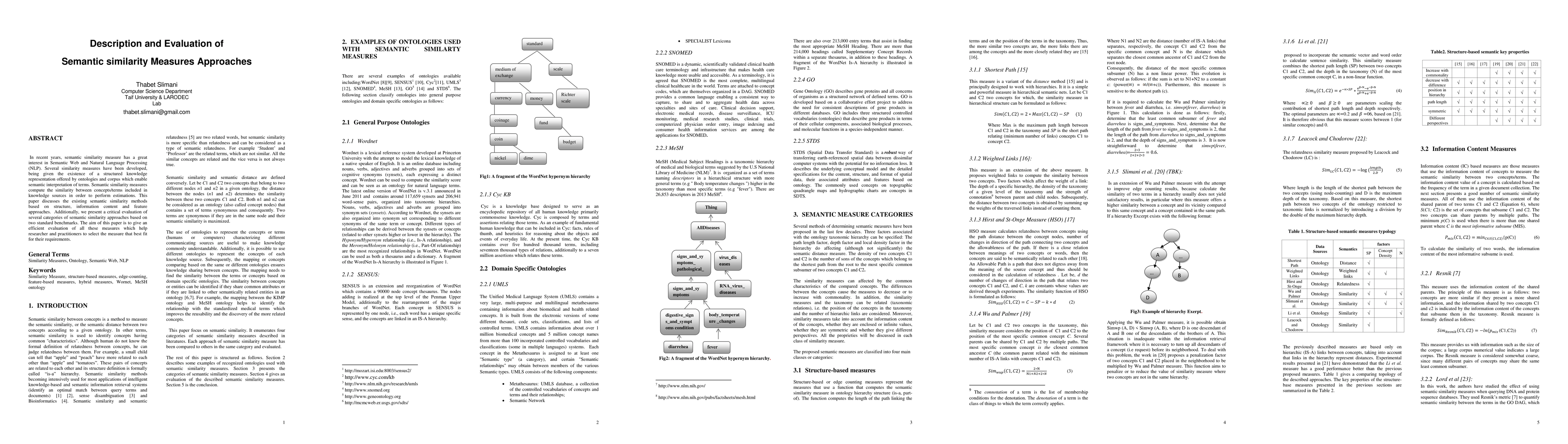 This paper reviews various semantic similarity measures, including structural, information content, and feature-based approaches, and evaluates them using standard benchmarks to assist researchers and practitioners in selecting the most appropriate method for their needs.