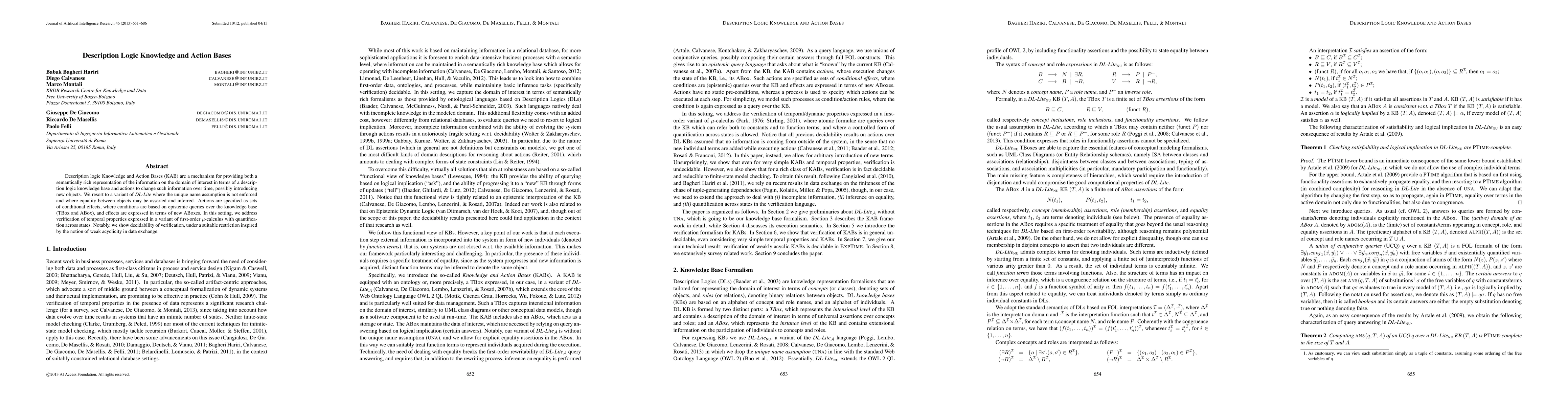 This paper introduces Description Logic Knowledge and Action Bases (KAB) to semantically represent domain information and specify actions to modify it, using a variant of DL-Lite without the unique name assumption. It addresses the verification of temporal properties using a first-order mu-calculus variant, proving decidability under a weak acyclicity restriction.