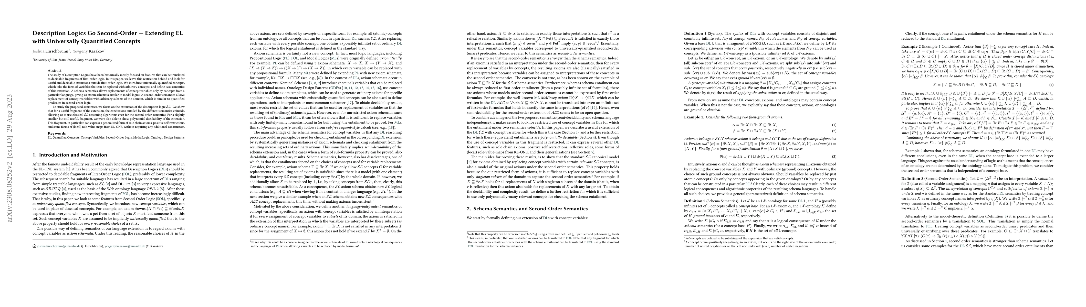 The study of Description Logics have been historically mostly focused on features that can be translated to decidable fragments of first-order logic. In this paper, we leave this restriction behind and look for useful and decidable extensions outside first-order logic. We introduce universally quantified concepts, which take the form of variables that can be replaced with arbitrary concepts, and define two semantics of this extension. A schema semantics allows replacements of concept variables only by concepts from a particular language, giving us axiom schemata similar to modal logics. A second-order semantics allows replacement of concept variables with arbitrary subsets of the domain, which is similar to quantified predicates in second-order logic. To study the proposed semantics, we focus on the extension of the description logic $\mathcal{EL}$. We show that for a useful fragment of the extension, the conclusions entailed by the different semantics coincide, allowing us to use classical $\mathcal{EL}$ reasoning algorithms even for the second-order semantics. For a slightly smaller, but still useful, fragment, we were also able to show polynomial decidability of the extension. This fragment, in particular, can express a generalized form of role chain axioms, positive self restrictions, and some forms of (local) role-value-maps from KL-ONE, without requiring any additional constructors.