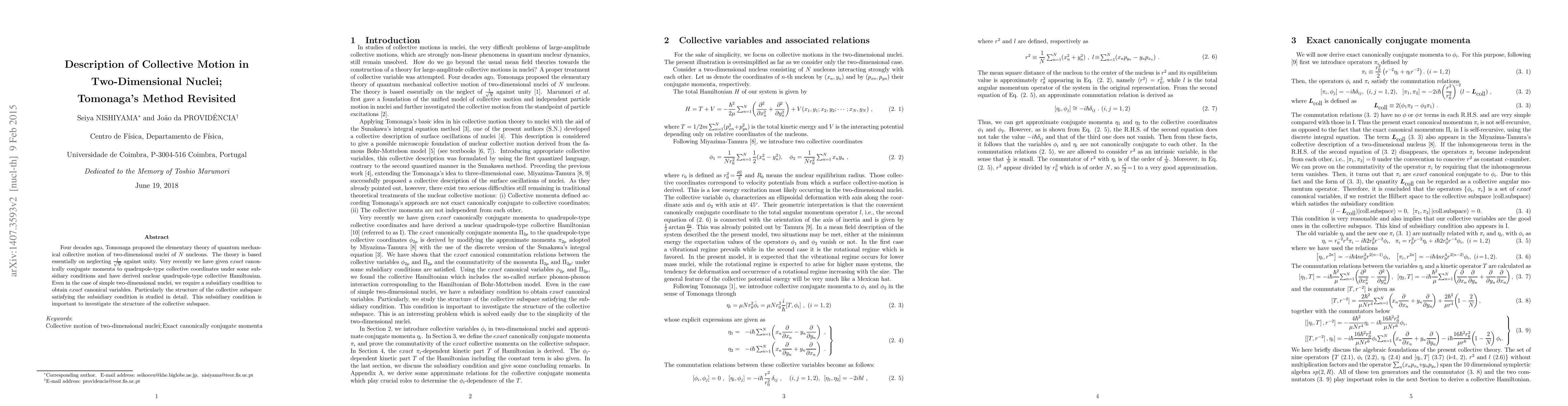 Four decades ago, Tomonaga proposed the elementary theory of quantum mechanical collective motion of two-dimensional nuclei of N nucleons. The theory is based essentially on the neglect of 1/sqrtN against unity. Very recently we have given exact canonically conjugate momenta to quadrupole-type collective coordinates under some subsidiary conditions and have derived nuclear quadrupole-type collective Hamiltonian. Even in the case of simple two-dimensional nuclei, we have a subsidiary condition to obtain exact canonical variables. Particularly the structure of the collective subspace satisfying the subsidiary condition is studied in detail. This subsidiary condition is important to investigate what is a structure of the collective subspace.