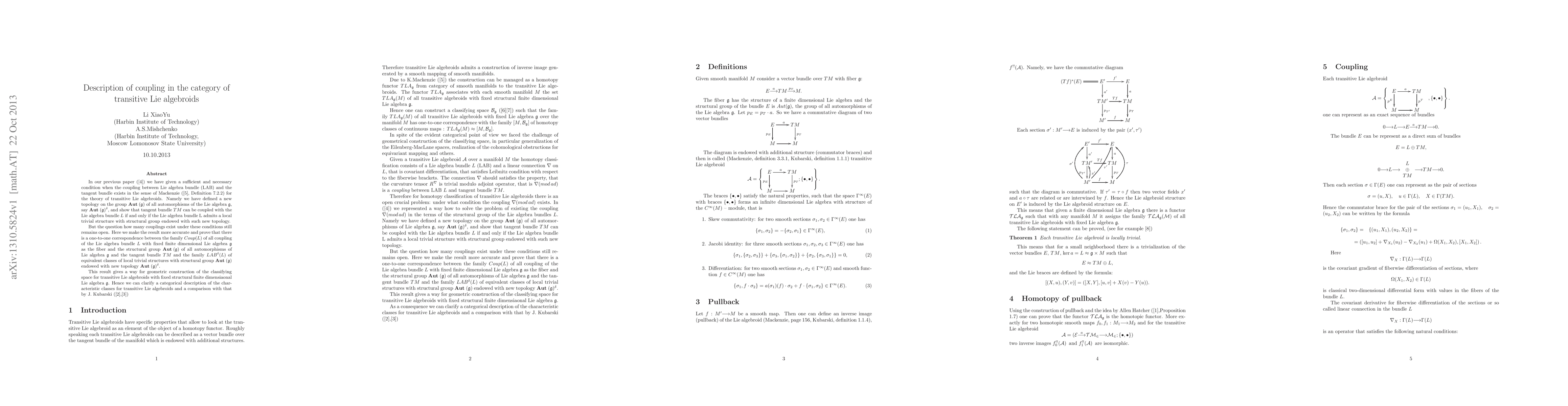 In our previous paper (arXiv:1306.5449) we have given a sufficient and necessary condition when the coupling between Lie algebra bundle (LAB) and the tangent bundle exists in the sense of Mackenzie (\cite{Mck-2005}, Definition 7.2.2) for the theory of transitive Lie algebroids. Namely we have defined a new topology on the group $\Aut(\rg)$ of all automorphisms of the Lie algebra $\rg$, say $\Aut(\rg)^{\delta}$, and show that tangent bundle $TM$ can be coupled with the Lie algebra bundle $L$ if and only if the Lie algebra bundle L admits a local trivial structure with structural group endowed with such new topology. But the question how many couplings exist under these conditions still remains open. Here we make the result more accurate and prove that there is a one-to-one correspondence between the family $Coup(L)$ of all coupling of the Lie algebra bundle $L$ with fixed finite dimensional Lie algebra $\rg$ as the fiber and the structural group $\Aut(\rg)$ of all automorphisms of Lie algebra $\rg$ and the tangent bundle $TM$ and the family $LAB^{\delta}(L)$ of equivalent classes of local trivial structures with structural group $\Aut(\rg)$ endowed with new topology $\Aut(\rg)^{\delta}$. This result gives a way for geometric construction of the classifying space for transitive Lie algebroids with fixed structural finite dimensiaonal Lie algebra $\rg$. Hence we can clarify a categorical description of the characteristic classes for transitive Lie algebroids and a comparison with that by J. Kubarski.