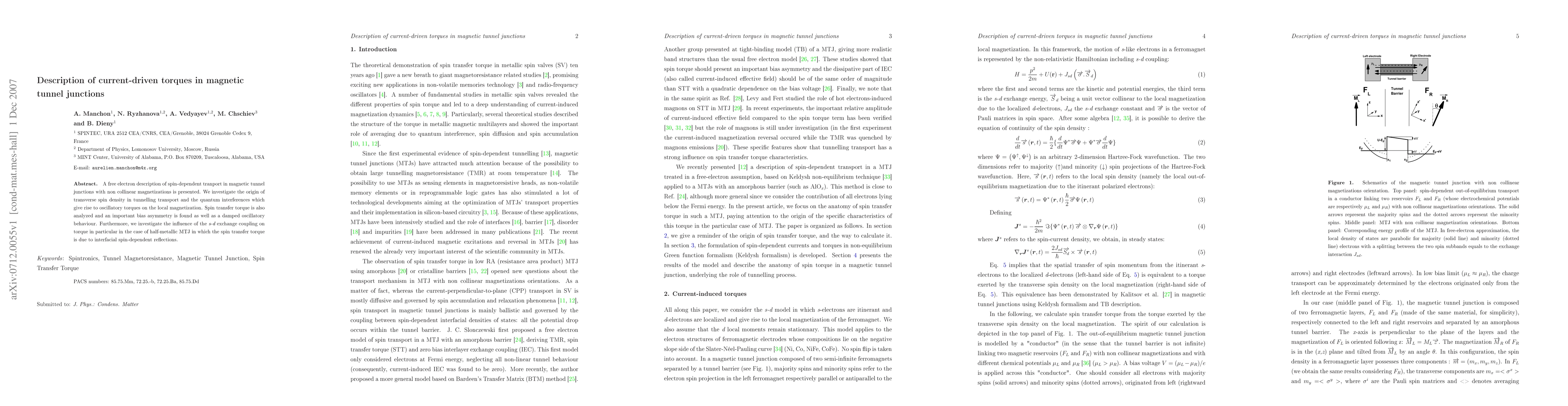 A free electron description of spin-dependent tranport in magnetic tunnel junctions with non collinear magnetizations is presented. We investigate the origin of transverse spin density in tunnelling transport and the quantum interferences which give rise to oscillatory torques on the local magnetization. Spin transfer torque is also analyzed and an important bias asymmetry is found as well as a damped oscillatory behaviour. Furthermore, we investigate the influence of the s-d exchange coupling on torque in particular in the case of half-metallic MTJ in which the spin transfer torque is due to interfacial spin-dependent reflections.