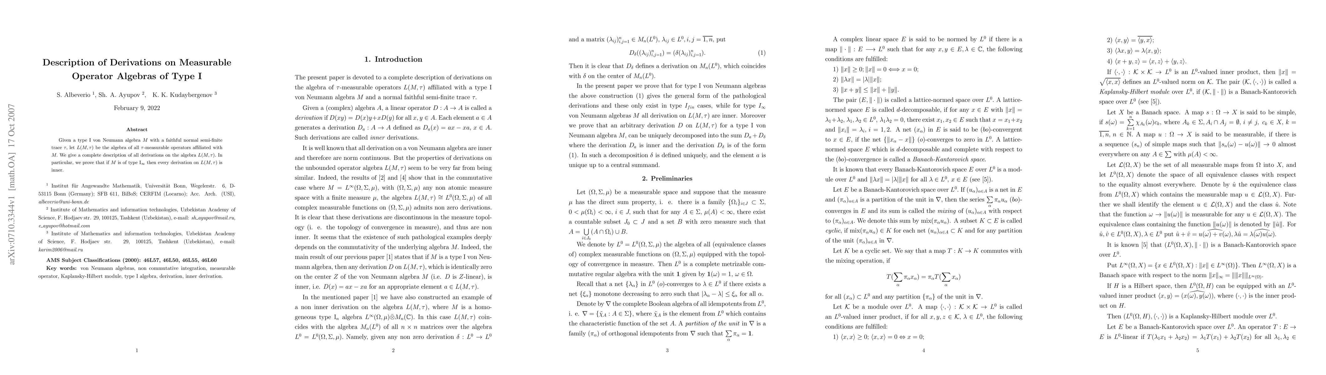 Given a type I von Neumann algebra $M$ with a faithful normal semi-finite trace $\tau,$ let $L(M, \tau)$ be the algebra of all $\tau$-measurable operators affiliated with $M.$ We give a complete description of all derivations on the algebra $L(M, \tau).$ In particular, we prove that if $M$ is of type I$_\infty$ then every derivation on $L(M, \tau)$ is inner.