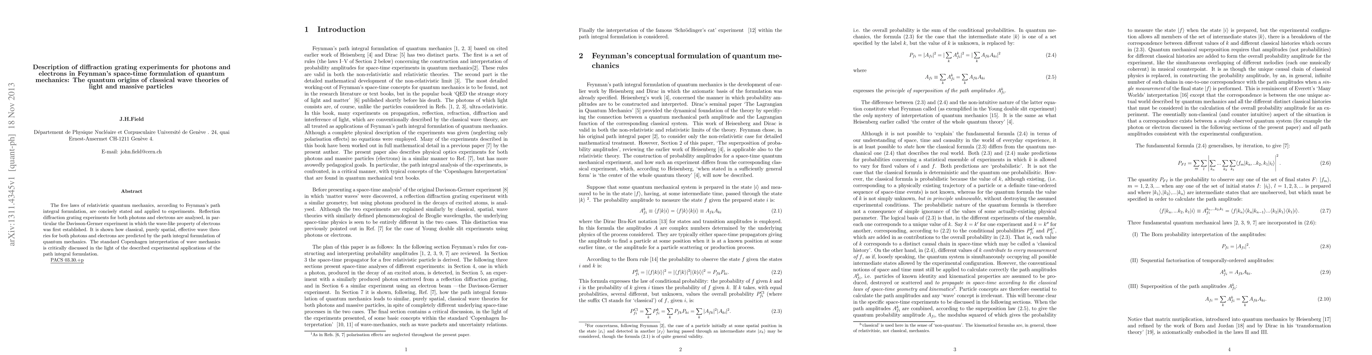 The five laws of relativistic quantum mechanics, according to Feynman's path integral formulation, are concisely stated and applied to experiments. Reflection diffraction grating experiments for both photons and electrons are analysed, in particular the Davisson-Germer experiment in which the wave-like property of electrons was first established. It is shown how classical, purely spatial, effective wave theories for both photons and electrons are predicted by the path integral formulation of quantum mechanics. The standard Copenhagen interpretation of wave mechanics is critically discussed in the light of the described experimental applications of the path integral formulation.