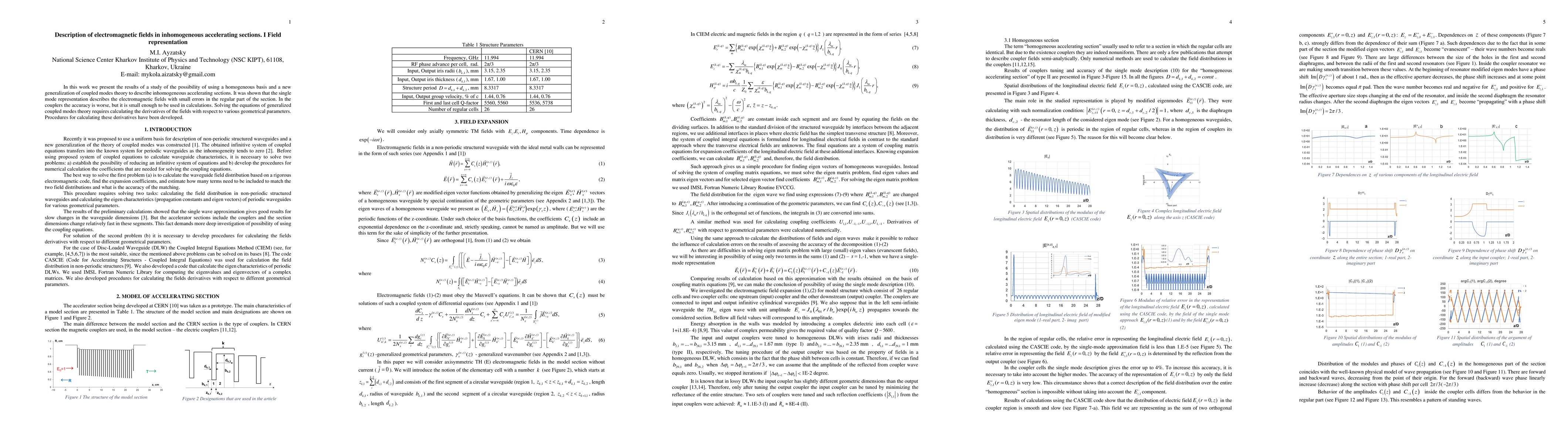 In this work we present the results of a study of the possibility of using a homogeneous basis and a new generalization of coupled modes theory to describe inhomogeneous accelerating sections. It was shown that the single mode representation describes the electromagnetic fields with small errors in the regular part of the section. In the couplers the accuracy is worse, but it is small enough to be used in calculations. Solving the equations of generalized coupled modes theory requires calculating the derivatives of the fields with respect to various geometrical parameters. Procedures for calculating these derivatives have been developed.