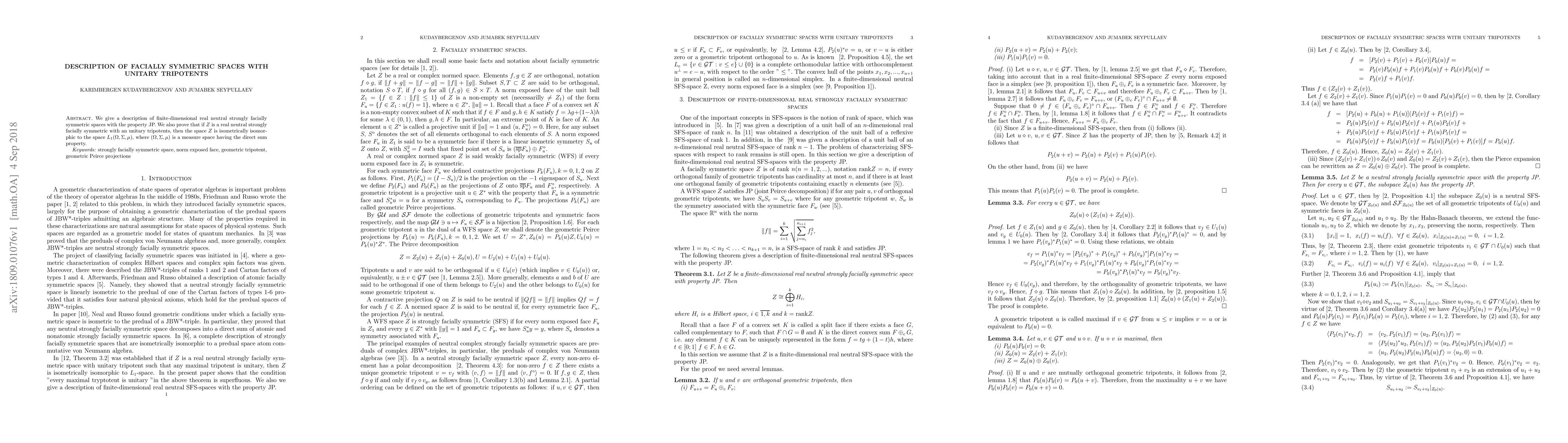 We give a description of finite-dimensional real neutral strongly facially symmetric spaces with the property JP. We also prove that if \(Z\) is a real neutral strongly facially symmetric with an unitary tripotents, then the space \(Z\) is isometrically isomorphic to the space \(L_1(\Omega,\Sigma, \mu),\) where \((\Omega,\Sigma, \mu)\) is a measure space having the direct sum property.