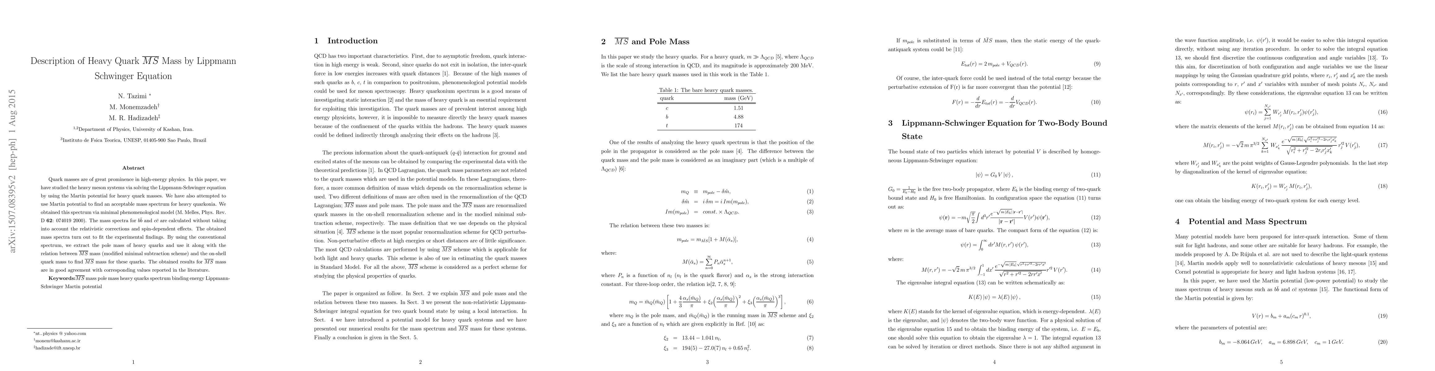 Quark masses are of great prominence in high-energy physics. In this paper, we have studied the heavy meson systems via solving the Lippmann-Schwinger equation by using the Martin potential for heavy quark masses. We have also attempted to use Martin potential to find an acceptable mass spectrum for heavy quarkonia. We obtained this spectrum via minimal phenomenological model (M. Melles, Phys. Rev. D \textbf{62}: 074019 2000). The mass spectra for $b\bar{b}$ and $c\bar{c}$ are calculated without taking into account the relativistic corrections and spin-dependent effects. The obtained mass spectra turn out to fit the experimental findings. By using the conventional spectrum, we extract the pole mass of heavy quarks and use it along with the relation between $\overline{MS}$ mass (modified minimal subtraction scheme) and the on-shell quark mass to find $\overline{MS}$ mass for these quarks. The obtained results for $\overline{MS}$ mass are in good agreement with corresponding values reported in the literature.