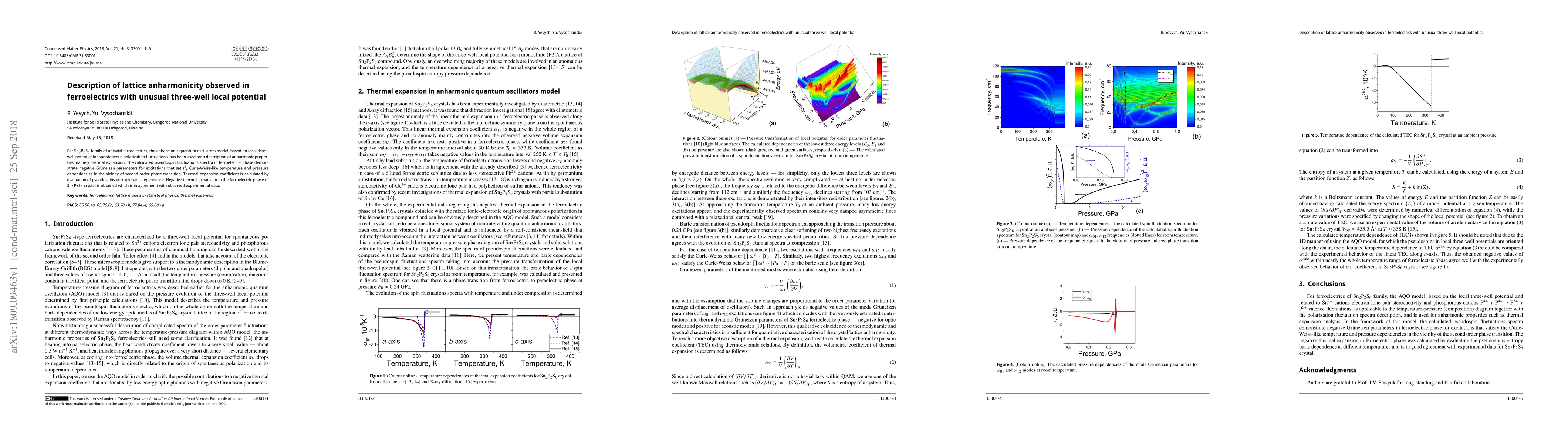 For Sn$_2$P$_2$S$_6$ family of uniaxial ferroelectrics, the anharmonic quantum oscillators model, based on local three-well potential for spontaneous polarization fluctuations, has been used for a description of anharmonic properties, namely thermal expansion. The calculated pseudospin fluctuations spectra in ferroelectric phase demonstrate negative Gr\"{u}neisen parameters for excitations that satisfy Curie-Weiss-like temperature and pressure dependencies in the vicinity of second order phase transition. Thermal expansion coefficient is calculated by evaluation of pseudospins entropy baric dependence. Negative thermal expansion in the ferroelectric phase of Sn$_2$P$_2$S$_6$ crystal is obtained which is in agreement with observed experimental data.