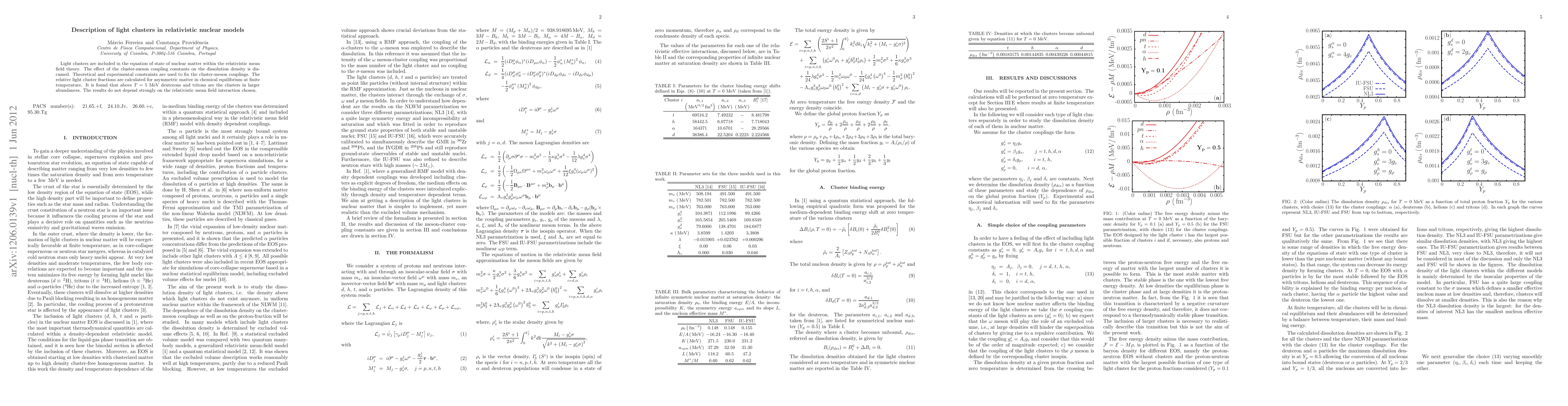 This paper investigates light clusters in relativistic nuclear models, focusing on their dissolution density influenced by cluster-meson coupling constants. It finds that deuterons and tritons are most abundant above 5 MeV, with results showing minimal dependence on the chosen relativistic mean field interaction.