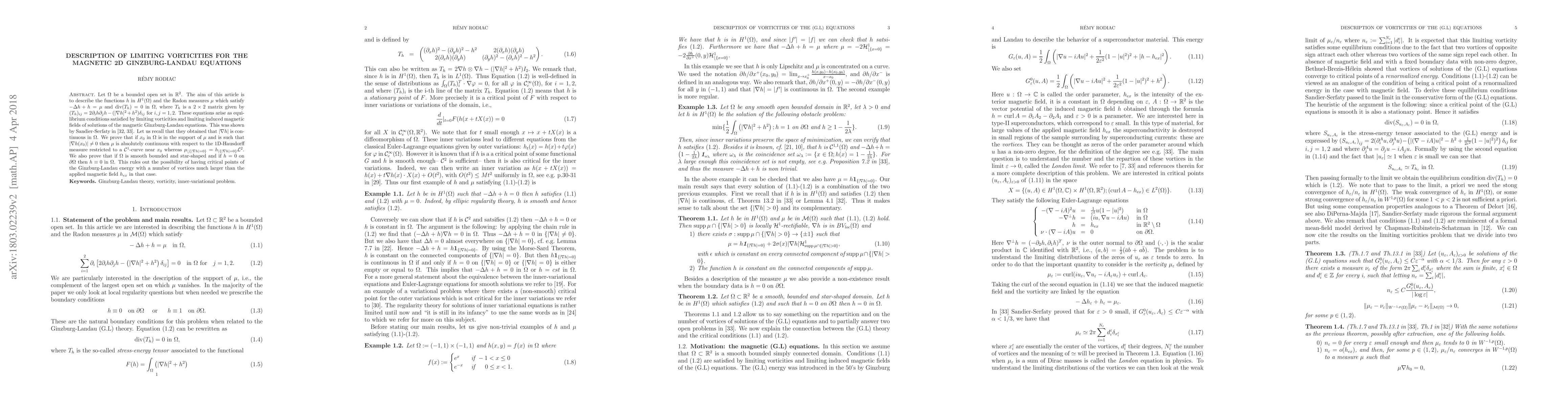 Let $\Omega$ be a bounded open set in $\mathbb{R}^2$. The aim of this article is to describe the functions $h$ in $H^1(\Omega)$ and the Radon measures $\mu$ which satisfy $-\Delta h+h=\mu$ and $ div(T_h)=0$ in $\Omega$, where $T_h$ is a $2\times 2$ matrix given by $(T_h)_{ij}=2\partial_ih\partial_jh- (|\nabla h|^2+h^2)\delta_{ij}$ for $i,j=1,2$. These equations arise as equilibrium conditions satisfied by limiting vorticities and limiting induced magnetic fields of solutions of the magnetic Ginzburg-Landau equations as shown by Sandier-Serfaty. Let us recall that they obtained that $|\nabla h|$ is continuous in $\Omega$. We prove that if $x_0$ in $ \Omega$ belongs to $\supp \mu$ and is such that $|\nabla h(x_0)|\neq 0$ then $\mu$ is absolutely continuous with respect to the 1D-Hausdorff measure restricted to a $\mathcal{C}^1$-curve near $x_0$ whereas $\mu_{\lfloor \{| \nabla h|=0\}}=h_{|\{ |\nabla h|=0\}}$. We also prove that if $\Omega$ is smooth bounded and star-shaped and if $h=0$ on $\partial \Omega$ then $h \equiv 0$ in $\Omega$. This rules out the possibility of having critical points of the Ginzburg-Landau energy with a number of vortices much larger than the applied magnetic field $h_{ex}$ in that case.