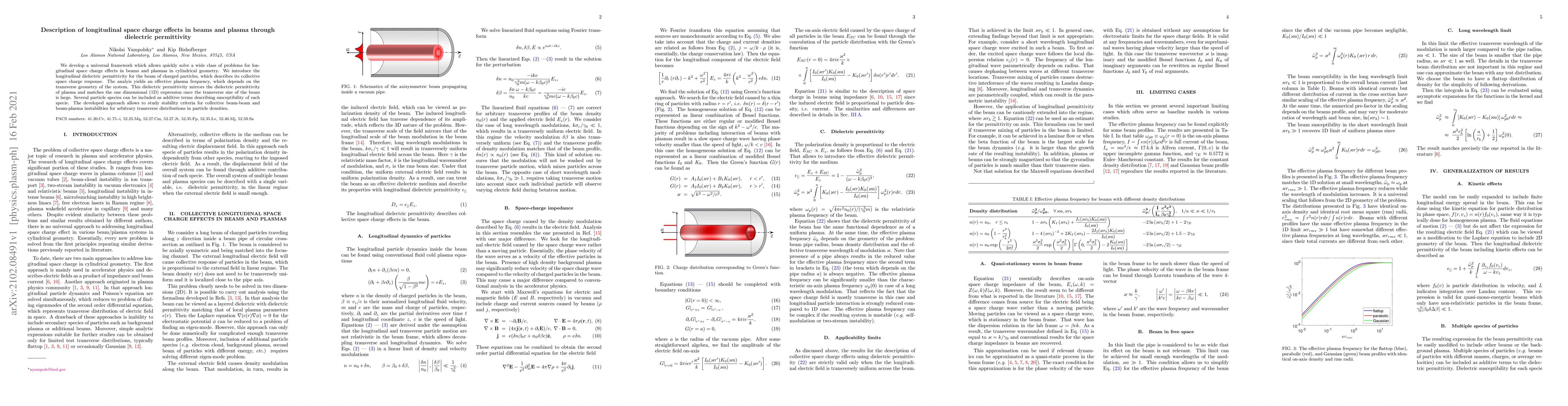 We develop a universal framework which allows quickly solve a wide class of problems for longitudinal space charge effects in beams and plasmas in cylindrical geometry. We introduce the longitudinal dielectric permittivity for the beam of charged particles, which describes its collective space charge response. The analyis yields an effective plasma frequency, which depends on the transverse geometry of the system. This dielectric permittivity mirrors the dielectric permittivity of plasma and matches the one dimensional (1D) expression once the transverse size of the beam is large. Several particle species can be included as additive terms describing susceptibility of each specie. The developed approach allows to study stability criteria for collective beam-beam and beam-plasma instabilities for arbitrary transverse distributions in particle densities.