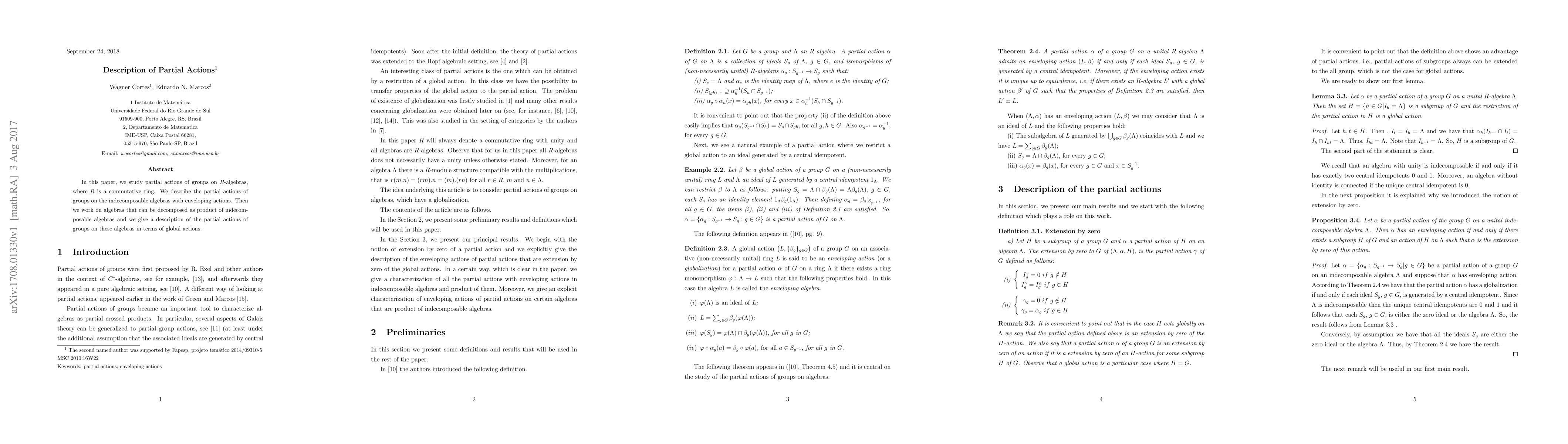This paper explores partial actions of groups on $R$-algebras, particularly focusing on indecomposable algebras with enveloping actions, and extends the description to decomposable algebras in terms of global actions.