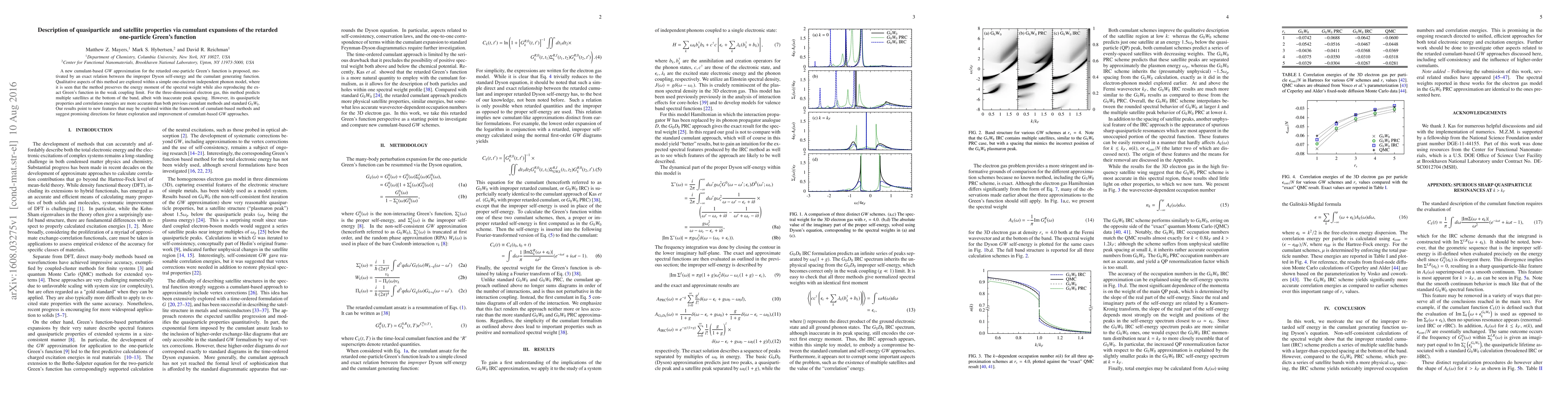 This paper proposes a cumulant-based $GW$ approximation for the retarded one-particle Green's function, showing it preserves spectral weight and accurately predicts quasiparticle properties and correlation energies for a three-dimensional electron gas, despite inaccuracies in satellite peak spacing. Future improvements are suggested for cumulant-based $GW$ methods.