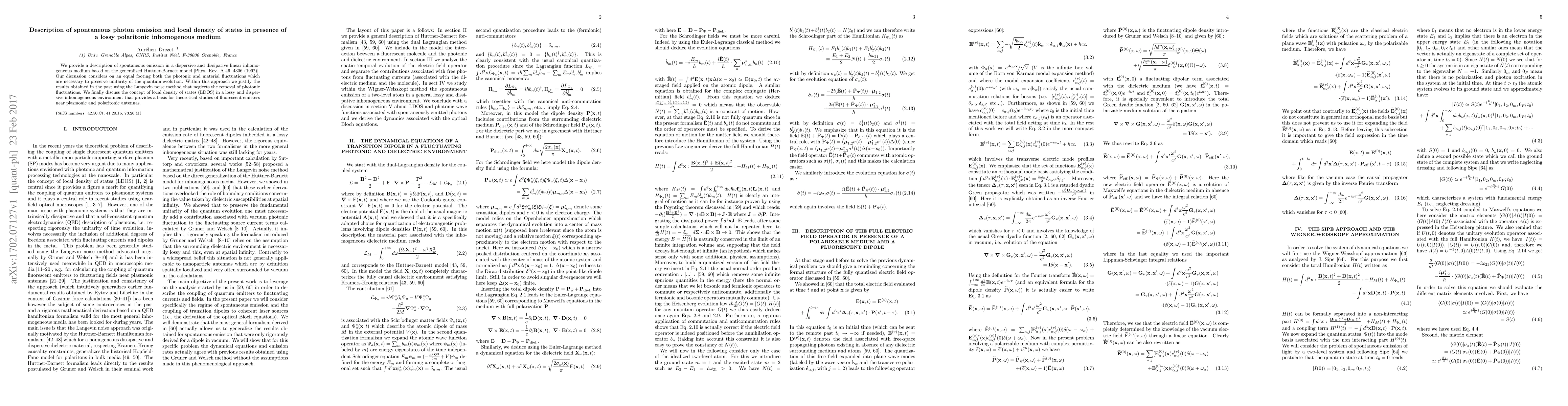 This paper describes spontaneous photon emission in a dispersive and dissipative inhomogeneous medium using the generalized Huttner-Barnett model, ensuring unitarity by considering both photonic and material fluctuations. It also discusses the local density of states in such environments, relevant for studies of fluorescent emitters near plasmonic antennas.