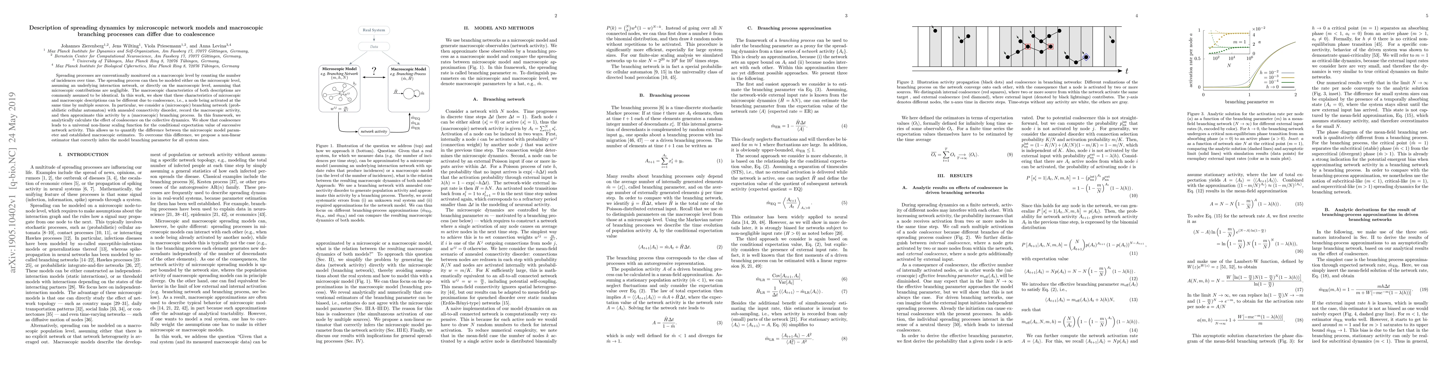This paper investigates how microscopic network models and macroscopic branching processes can differ in their spreading dynamics due to coalescence, where a node is activated by multiple sources simultaneously. The authors analytically calculate the effect of coalescence and propose a non-linear estimator to accurately infer the branching parameter, overcoming discrepancies between microscopic and macroscopic descriptions.