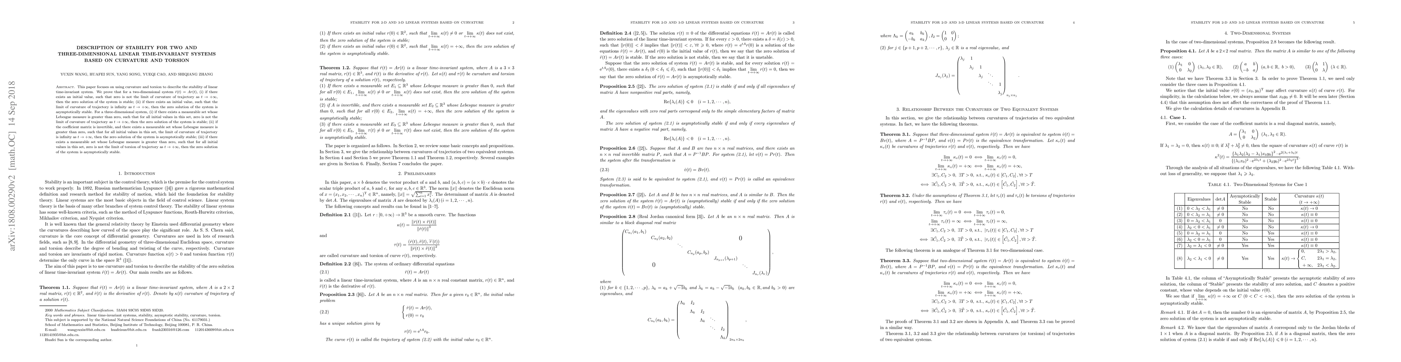 This paper introduces a new method to analyze stability in linear time-invariant systems using curvature and torsion, providing conditions for stability and asymptotic stability in 2D and 3D systems.
