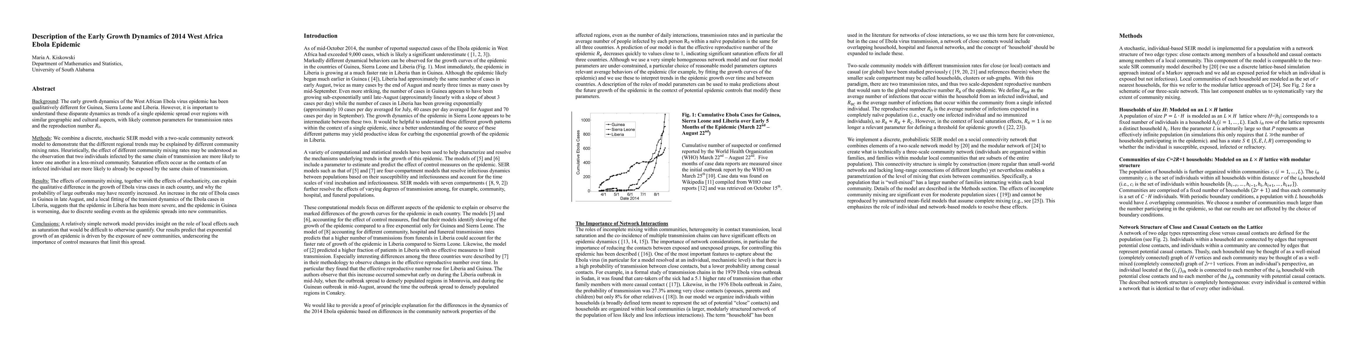${\bf Background:}$ The early growth dynamics of the West African Ebola virus epidemic has been qualitatively different for Guinea, Sierra Leone and Liberia. However, it is important to understand these disparate dynamics as trends of a single epidemic spread over regions with similar geographic and cultural aspects, with likely common parameters for transmission rates and the reproduction number $R_0$. ${\bf Methods:}$ We combine a discrete, stochastic SEIR model with a two-scale community network model to demonstrate that the different regional trends may be explained by different community mixing rates. Heuristically, the effect of different community mixing rates may be understood as the observation that two individuals infected by the same chain of transmission are more likely to know one another in a less-mixed community. Saturation effects occur as the contacts of an infected individual are more likely to already be exposed by the same chain of transmission. ${\bf Results:}$ The effects of community mixing, together with the effects of stochasticity, can explain the qualitative difference in the growth of Ebola virus cases in each country, and why the probability of large outbreaks may have recently increased. An increase in the rate of Ebola cases in Guinea in late August, and a local fitting of the transient dynamics of the Ebola cases in Liberia, suggests that the epidemic in Liberia has been more severe, and the epidemic in Guinea is worsening, due to discrete seeding events as the epidemic spreads into new communities. ${\bf Conclusions:}$ A relatively simple network model provides insight on the role of local effects such as saturation that would be difficult to otherwise quantify. Our results predict that exponential growth of an epidemic is driven by the exposure of new communities, underscoring the importance of control measures that limit this spread.