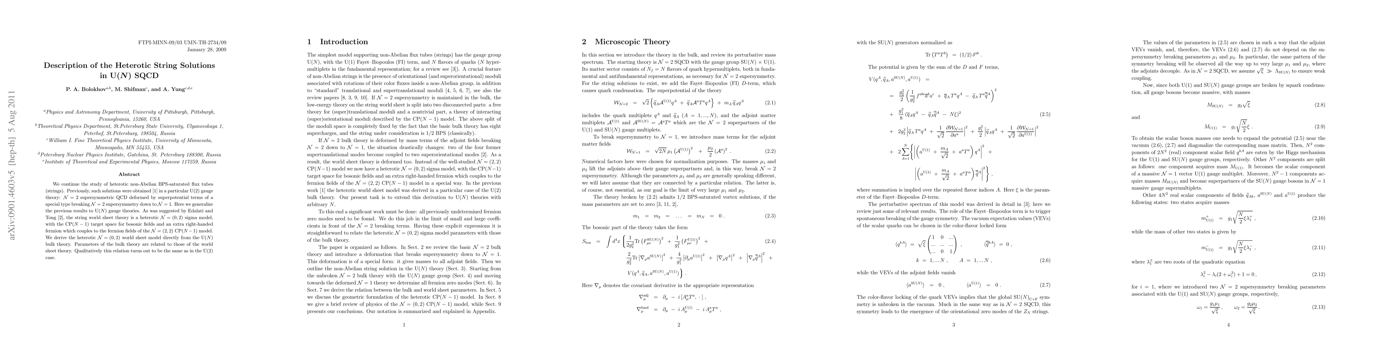 This paper generalizes the study of heterotic non-Abelian BPS-saturated flux tubes in U(N) supersymmetric QCD, deriving a heterotic N=(0,2) world sheet model from the U(N) bulk theory. The relation between bulk and world sheet parameters is qualitatively similar to the U(2) case.