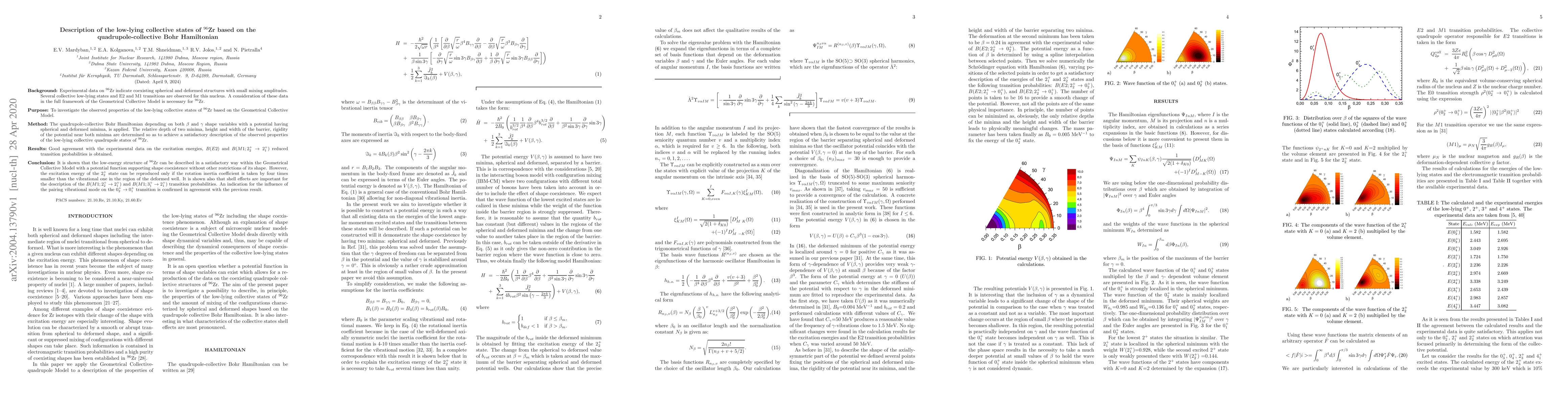 This paper uses the quadrupole-collective Bohr Hamiltonian to describe the low-lying collective states of $^{96}$Zr, showing coexistence of spherical and deformed structures. The model successfully reproduces experimental data on excitation energies and transition probabilities, highlighting the importance of shell effects and the influence of pairing on certain transitions.