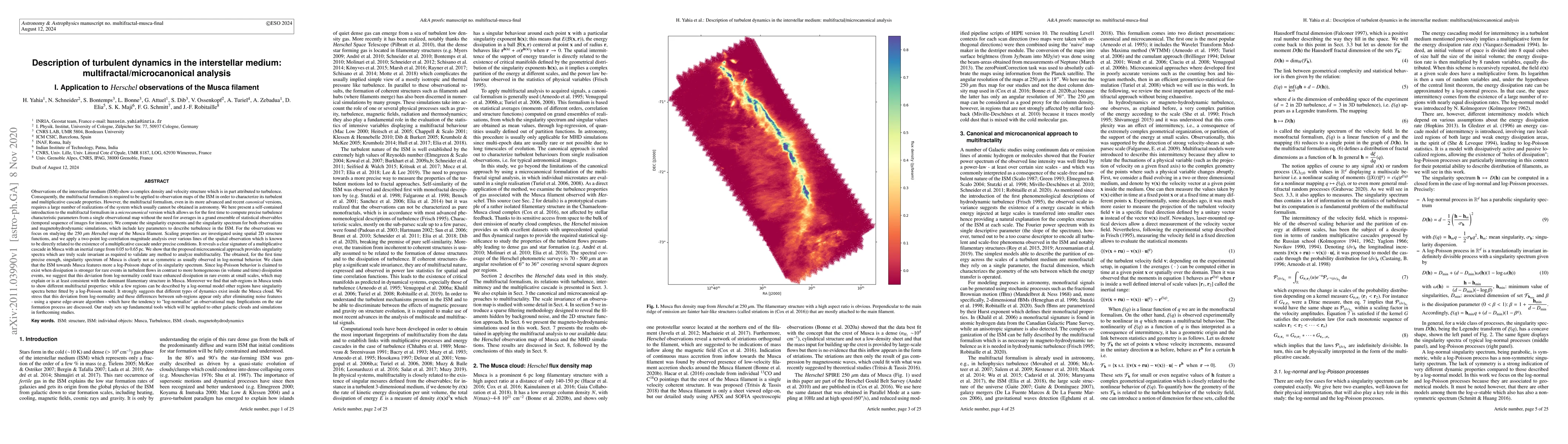 Observations of the interstellar medium (ISM) show a complex density and velocity structure which is in part attributed to turbulence. We here present a self-contained introduction to the multifractal formalism in a microcanonical version which allows us for the first time to compute precise turbulence characteristic parameters from a single observational map without the need for averages in a grand ensemble of statistical observables. We focus on studying the 250 mu-m Herschel map of the Musca filament and make use of MHD simulations. We find a clear signature of a multiplicative cascade in Musca with an inertial range from 0.05 to 0.65 pc. We show that the proposed microcanonical approach provides singularity spectra which are truly scale invariant as required to validate any method to analyze multifractality. The obtained, for the first time precise enough, singularity spectrum of Musca is clearly not as symmetric as usually observed in log-normal behavior. We claim that the ISM towards Musca features more a log-Poisson shape of its singularity spectrum. Since log-Poisson behavior is claimed to exist when dissipation is stronger for rare events in turbulent flows in contrast to more homogeneous (in volume and time) dissipation events, we suggest that this deviation from log-normality could trace enhanced dissipation in rare events at small scales, which may explain or is at least consistent with the dominant filamentary structure in Musca. Moreover we find that sub-regions in Musca tends to show different multifractal properties. It strongly suggests that different types of dynamics exist inside the Musca cloud. These differences between sub-regions appear only after eliminating noise features which have the tendency to "log-normalize" an observational map. Our study sets up fundamental tools which will be applied to other galactic clouds and simulations in forthcoming studies.