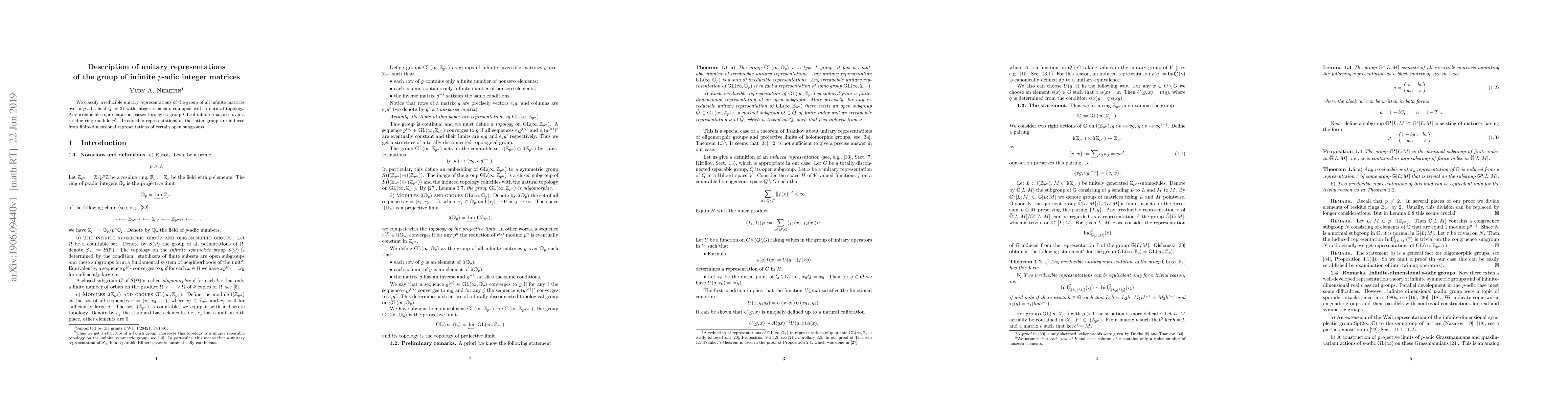 The paper classifies irreducible unitary representations of infinite $p$-adic integer matrix groups, showing they arise from representations of $GL$ over residue rings modulo $p^k$ induced from finite-dimensional representations of open subgroups. The results provide a comprehensive understanding of the structure of these representations.