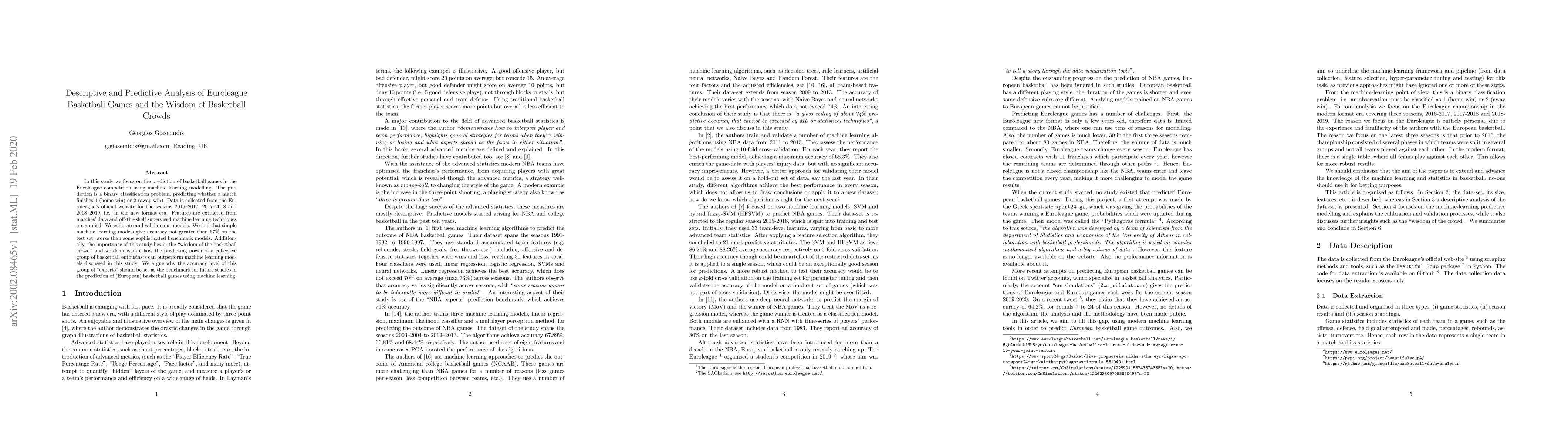 In this study we focus on the prediction of basketball games in the Euroleague competition using machine learning modelling. The prediction is a binary classification problem, predicting whether a match finishes 1 (home win) or 2 (away win). Data is collected from the Euroleague's official website for the seasons 2016-2017, 2017-2018 and 2018-2019, i.e. in the new format era. Features are extracted from matches' data and off-the-shelf supervised machine learning techniques are applied. We calibrate and validate our models. We find that simple machine learning models give accuracy not greater than 67% on the test set, worse than some sophisticated benchmark models. Additionally, the importance of this study lies in the "wisdom of the basketball crowd" and we demonstrate how the predicting power of a collective group of basketball enthusiasts can outperform machine learning models discussed in this study. We argue why the accuracy level of this group of "experts" should be set as the benchmark for future studies in the prediction of (European) basketball games using machine learning.