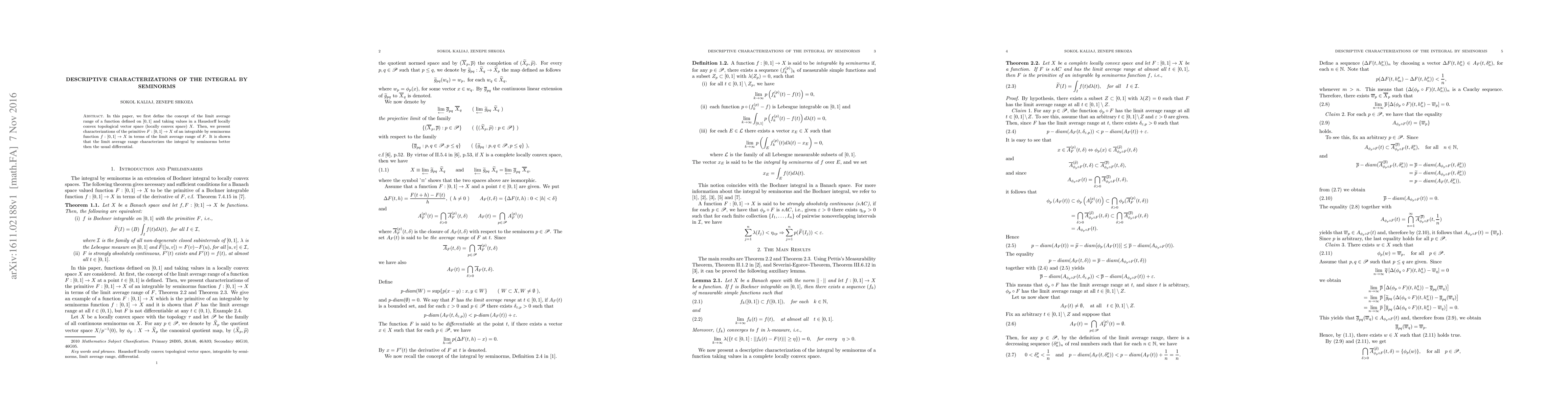 In this paper, we first define the concept of the limit average range of a function defined on $[0,1]$ and taking values in a Hausdorff locally convex topological vector space (locally convex space) $X$. Then, we present characterizations of the primitive $F:[0,1] \to X$ of an integrable by seminorms function $f:[0,1] \to X$ in terms of the limit average range of $F$. It is shown that the limit average range characterizes the integral by seminorms better then the usual differential.