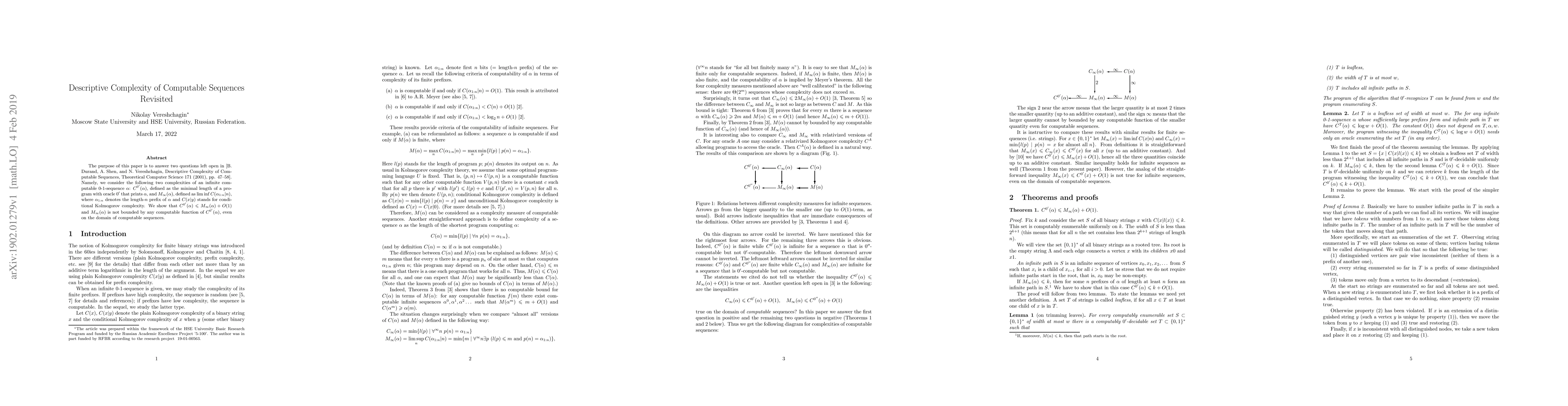The purpose of this paper is to answer two questions left open in [B. Durand, A. Shen, and N. Vereshchagin, Descriptive Complexity of Computable Sequences, Theoretical Computer Science 171 (2001), pp. 47--58]. Namely, we consider the following two complexities of an infinite computable 0-1-sequence $\alpha$: $C^{0'}(\alpha )$, defined as the minimal length of a program with oracle $0'$ that prints $\alpha$, and $M_{\infty}(\alpha)$, defined as $\liminf C(\alpha_{1:n}|n)$, where $\alpha_{1:n}$ denotes the length-$n$ prefix of $\alpha$ and $C(x|y)$ stands for conditional Kolmogorov complexity. We show that $C^{0'}(\alpha )\le M_{\infty}(\alpha)+O(1)$ and $M_{\infty}(\alpha)$ is not bounded by any computable function of $C^{0'}(\alpha )$, even on the domain of computable sequences.