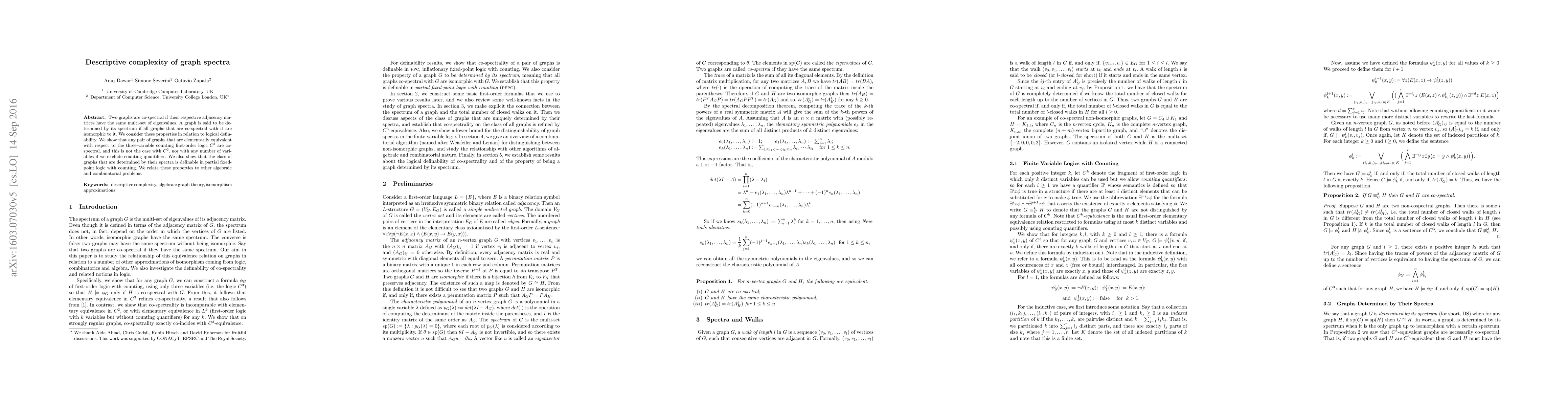 This research paper explores the relationship between graph spectra and logical definability. It establishes that elementarily equivalent graphs in three-variable counting first-order logic ($C^3$) share the same spectrum, a property not holding for $C^2$ or fewer variables without counting quantifiers. The study further reveals that graphs determined by their spectra can be defined using partial fixed-point logic with counting, linking these properties to broader algebraic and combinatorial problems.