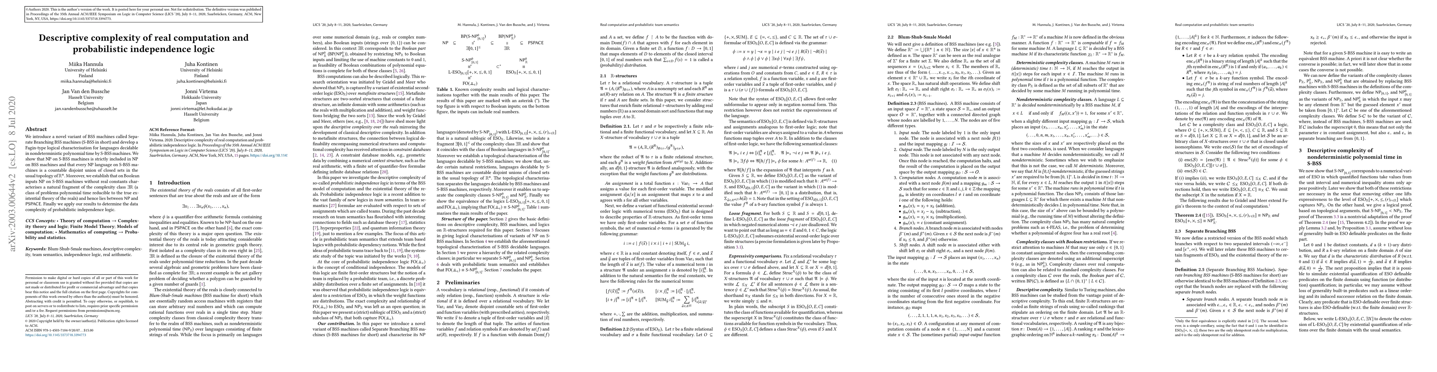 We introduce a novel variant of BSS machines called Separate Branching BSS machines (S-BSS in short) and develop a Fagin-type logical characterisation for languages decidable in non-deterministic polynomial time by S-BSS machines. We show that NP on S-BSS machines is strictly included in NP on BSS machines and that every NP language on S-BSS machines is a countable union of closed sets in the usual topology of R^n. Moreover, we establish that on Boolean inputs NP on S-BSS machines without real constants characterises a natural fragment of the complexity class existsR (a class of problems polynomial time reducible to the true existential theory of the reals) and hence lies between NP and PSPACE. Finally we apply our results to determine the data complexity of probabilistic independence logic.