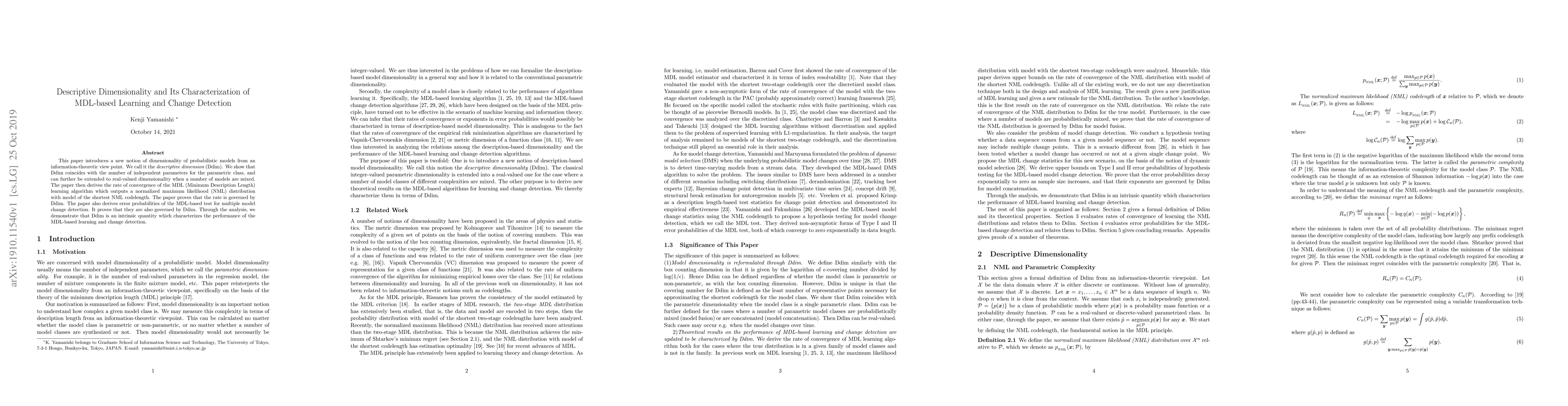 This paper introduces a new notion of dimensionality of probabilistic models from an information-theoretic view point. We call it the "descriptive dimension"(Ddim). We show that Ddim coincides with the number of independent parameters for the parametric class, and can further be extended to real-valued dimensionality when a number of models are mixed. The paper then derives the rate of convergence of the MDL (Minimum Description Length) learning algorithm which outputs a normalized maximum likelihood (NML) distribution with model of the shortest NML codelength. The paper proves that the rate is governed by Ddim. The paper also derives error probabilities of the MDL-based test for multiple model change detection. It proves that they are also governed by Ddim. Through the analysis, we demonstrate that Ddim is an intrinsic quantity which characterizes the performance of the MDL-based learning and change detection.