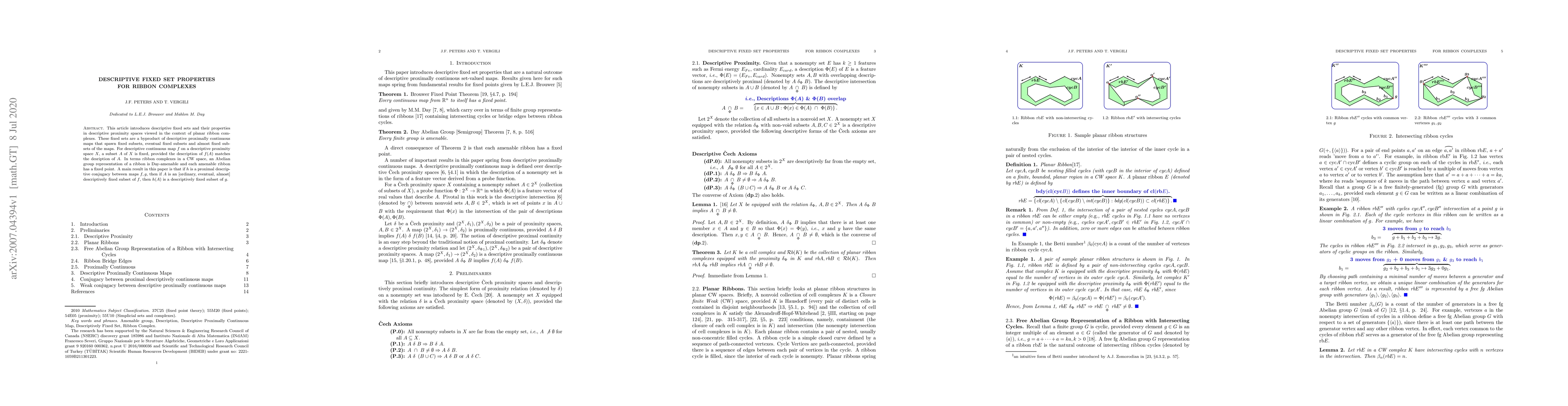 This article introduces descriptive fixed sets and their properties in descriptive proximity spaces viewed in the context of planar ribbon complexes. These fixed sets are a byproduct of descriptive proximally continuous maps that spawn fixed subsets, eventual fixed subsets and almost fixed subsets of the maps. For descriptive continuous map $f$ on a descriptive proximity space $X$, a subset $A$ of $X$ is fixed, provided the description of $f(A)$ matches the desription of $A$. In terms ribbon complexes in a CW space, an Abelian group representation of a ribbon is Day-amenable and each amenable ribbon has a fixed point. A main result in this paper is that if $h$ is a proximal descriptive conjugacy between maps $f,g$, then if $A$ is an [ordinary, eventual, almost] descriptively fixed subset of $f$, then $h(A)$ is a descriptively fixed subset of $g$.