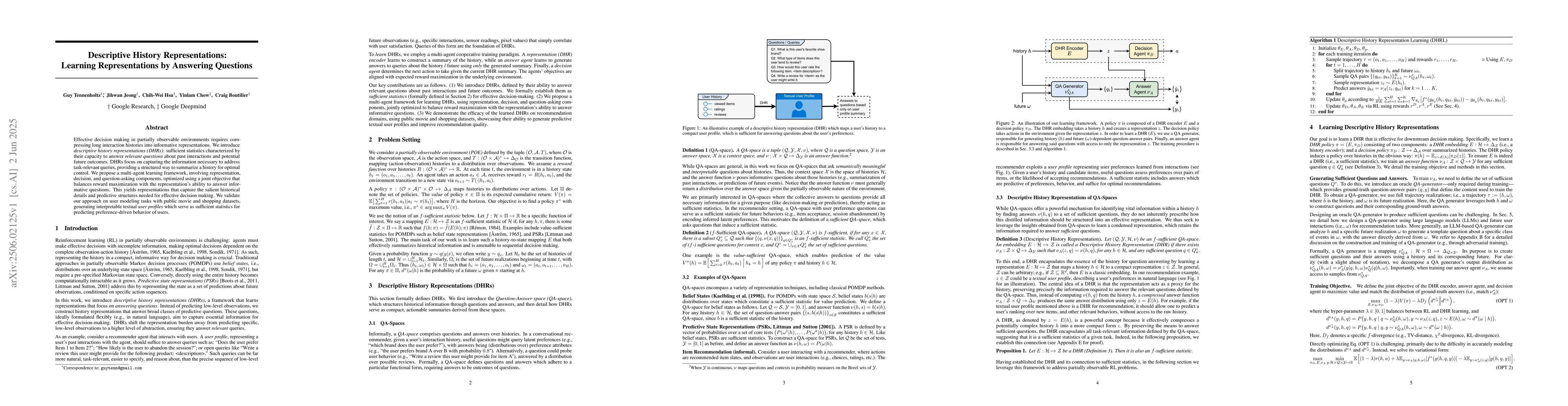 This paper introduces Descriptive History Representations (DHRs), which learn to answer questions about past interactions and potential future outcomes for effective decision making in partially observable environments. It proposes a multi-agent learning framework that balances reward maximization with representation's ability to answer informative questions, yielding interpretable textual user profiles that predict preference-driven behavior.