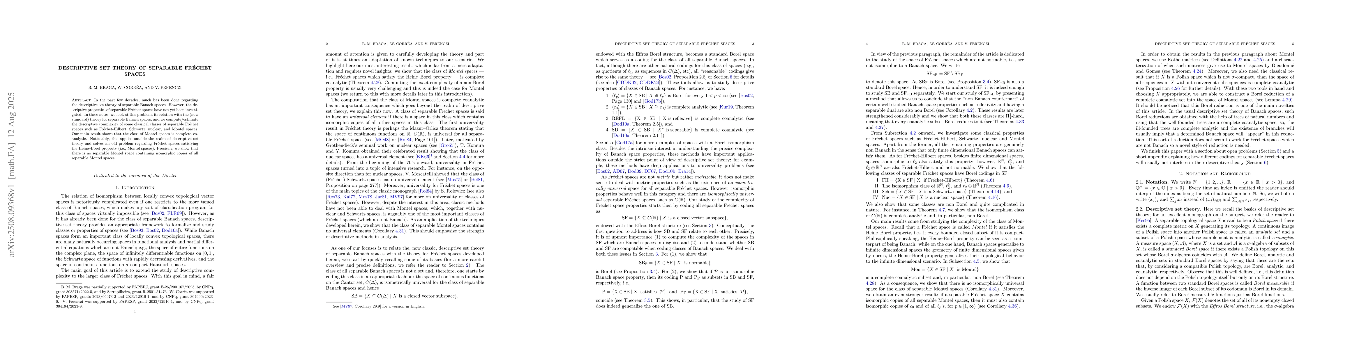 In the past few decades, much has been done regarding the descriptive set theory of separable Banach spaces. However, the descriptive properties of separable Fr\'echet spaces have not yet been investigated. In these notes, we look at this problem, its relation with the (now standard) theory for separable Banach spaces, and we compute/estimate the descriptive complexity of some classical classes of separable Fr\'echet spaces such as Fr\'echet-Hilbert, Schwartz, nuclear, and Montel spaces. Our main result shows that the class of Montel spaces is complete coanalytic. Noticeably, this applies outside the realm of descriptive set theory and solves an old problem regarding Fr\'echet spaces satisfying the Heine--Borel property (i.e., Montel spaces). Precisely, we show that there is no separable Montel space containing isomorphic copies of all separable Montel spaces.