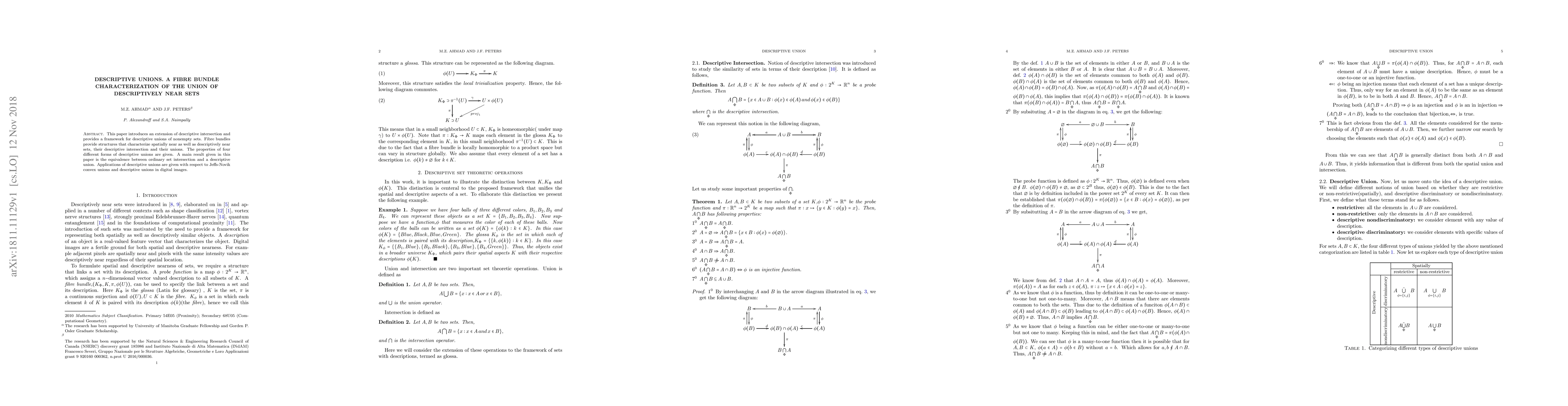 This paper introduces an extension of descriptive intersection and provides a framework for descriptive unions of nonempty sets. Fibre bundles provide structures that characterize spatially near as well as descriptively near sets, their descriptive intersection and their unions. The properties of four different forms of descriptive unions are given. A main result given in this paper is the equivalence between ordinary set intersection and a descriptive union. Applications of descriptive unions are given with respect to Jeffs-Novik convex unions and descriptive unions in digital images.