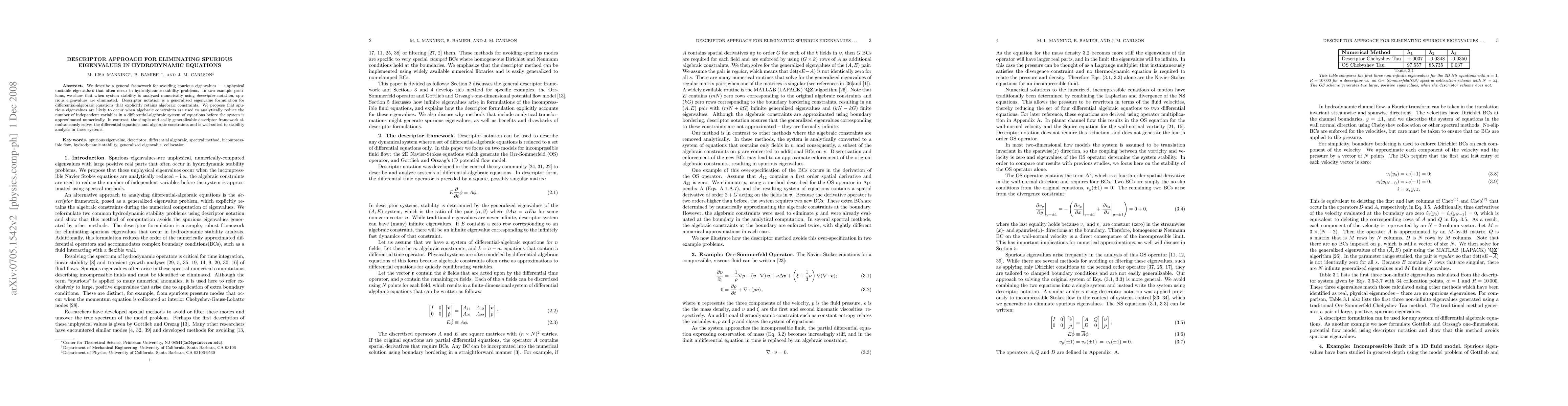 We describe a general framework for avoiding spurious eigenvalues -- unphysical unstable eigenvalues that often occur in hydrodynamic stability problems. In two example problems, we show that when system stability is analyzed numerically using {\em descriptor} notation, spurious eigenvalues are eliminated. Descriptor notation is a generalized eigenvalue formulation for differential-algebraic equations that explicitly retains algebraic constraints. We propose that spurious eigenvalues are likely to occur when algebraic constraints are used to analytically reduce the number of independent variables in a differential-algebraic system of equations before the system is approximated numerically. In contrast, the simple and easily generalizable descriptor framework simultaneously solves the differential equations and algebraic constraints and is well-suited to stability analysis in these systems.