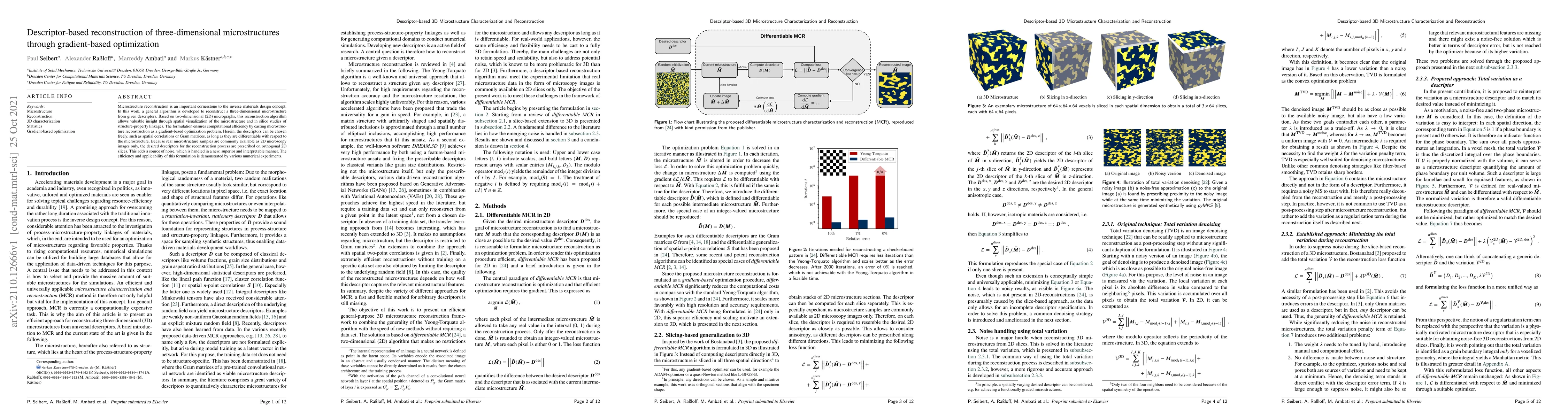 This paper presents an algorithm for reconstructing three-dimensional microstructures from two-dimensional micrographs using gradient-based optimization. The method efficiently handles noise from 2D slices and allows for the use of various differentiable descriptors, enabling in silico studies of structure-property relationships.