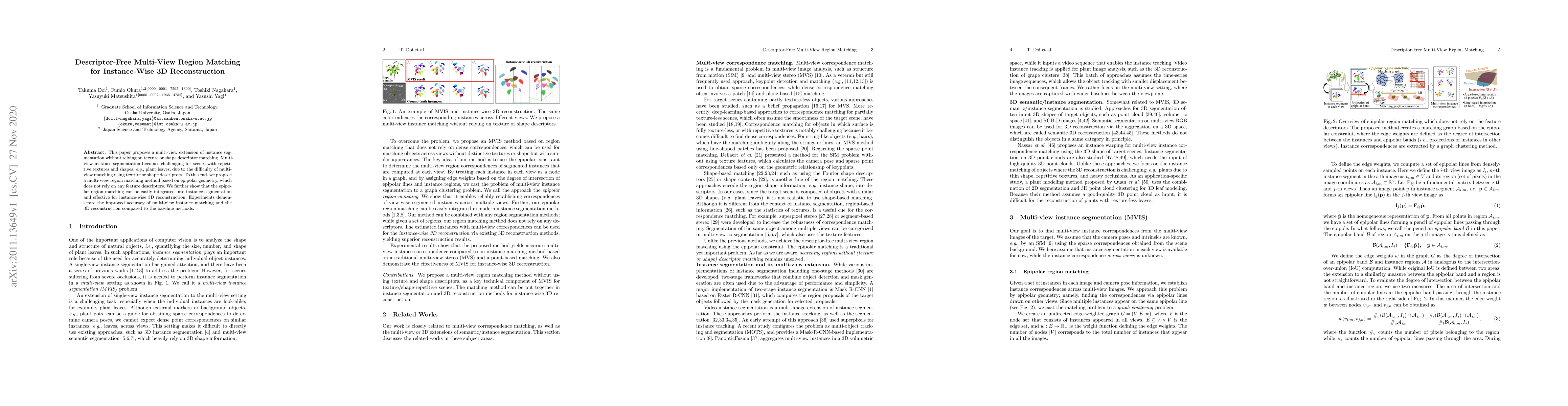 This paper introduces a descriptor-free multi-view region matching method based on epipolar geometry for instance segmentation, eliminating the need for texture or shape descriptors, and demonstrates its effectiveness in 3D reconstruction, outperforming baseline methods.