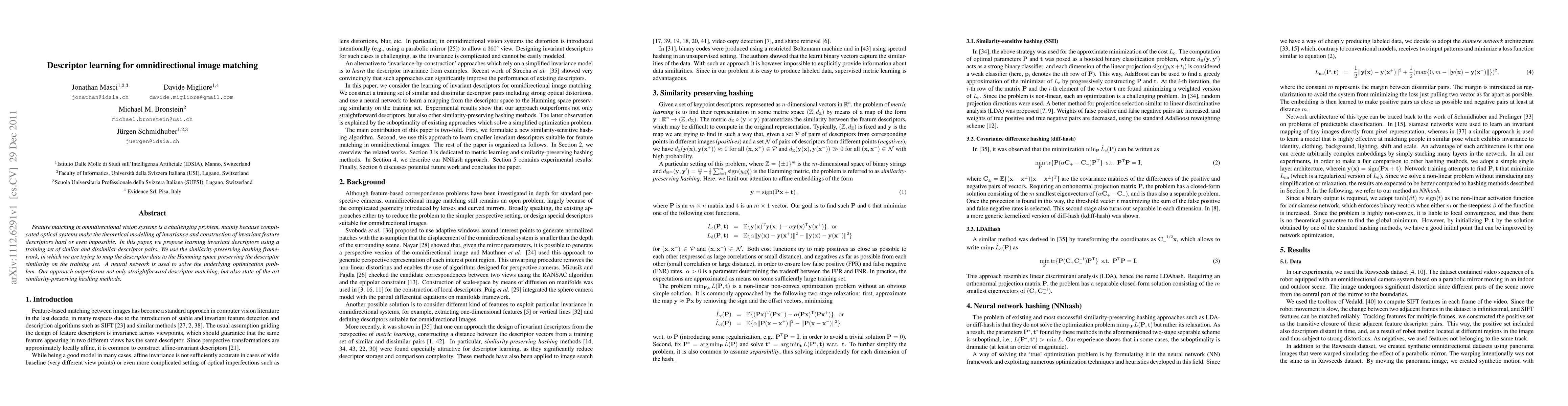 This paper proposes a method for learning invariant descriptors for omnidirectional image matching using a similarity-preserving hashing framework and neural networks, outperforming both traditional matching and existing similarity-preserving hashing techniques.
